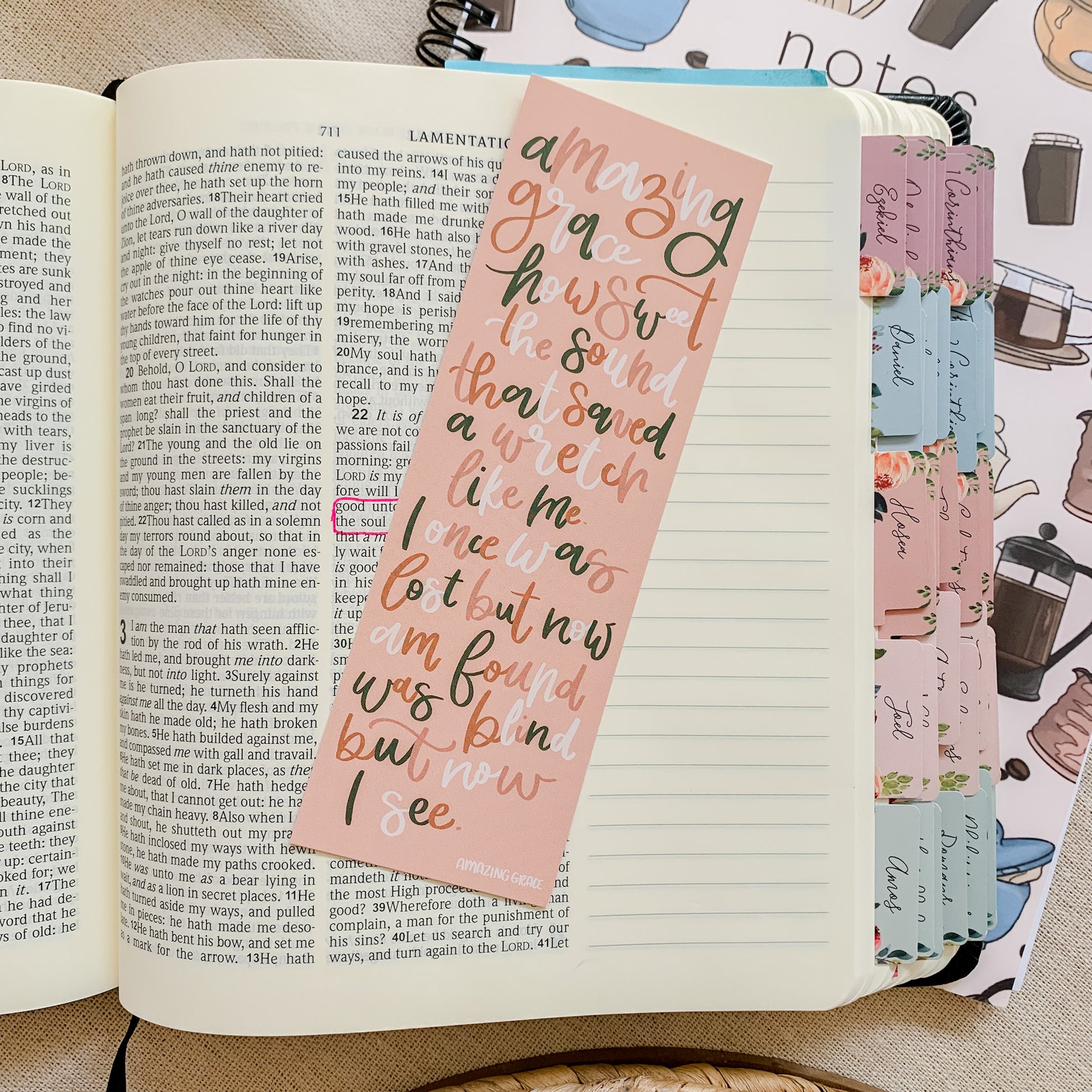Encouragement comes in many forms, and the "Amazing Grace" bookmark is just the perfect example. Be encouraged when you open your book whether it is your Bible, a school book, your planner, or a novel you are enjoying. Placing Biblical truth before your eyes wherever you go will help strengthen your walk of faith. Add a little bit of encouragement to your life today. Hand-lettered design on durable and high quality cardstock.