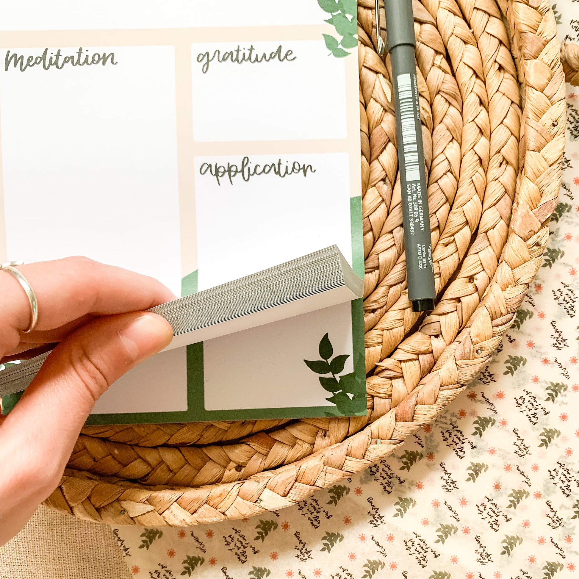 This notepad can be your greatest resource when it comes to diving into portions of the Scripture. After years of focusing on studying the Bible, these are a few categories that I find most helpful. Start by writing down the Scripture, highlighting that passage, and jotting down a few things that it makes you grateful for (remember to praise Him daily). The two biggest boxes allow for meditation on the Scripture passage and application - the two most important ways to study the Scripture (in my opinion anyway). If you run out of room, don't worry! Just flip it over and write on the back of the page. You can tear these pages out from the notepad with no hassle and tape them into your notebook or put them in your Bible (I like to use paper clips in my Bible or just stick them in without any attaching to the page).