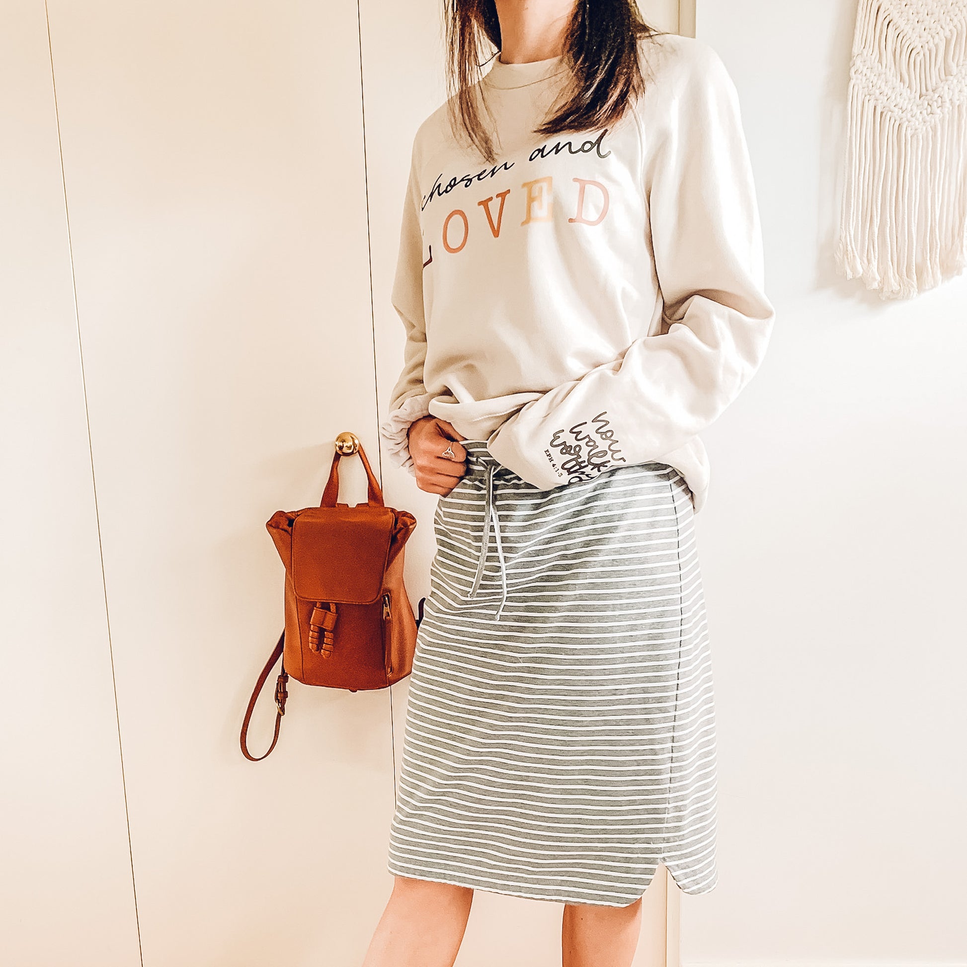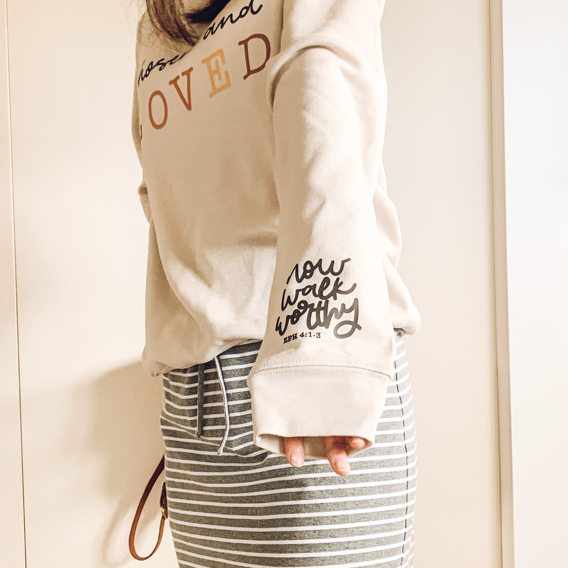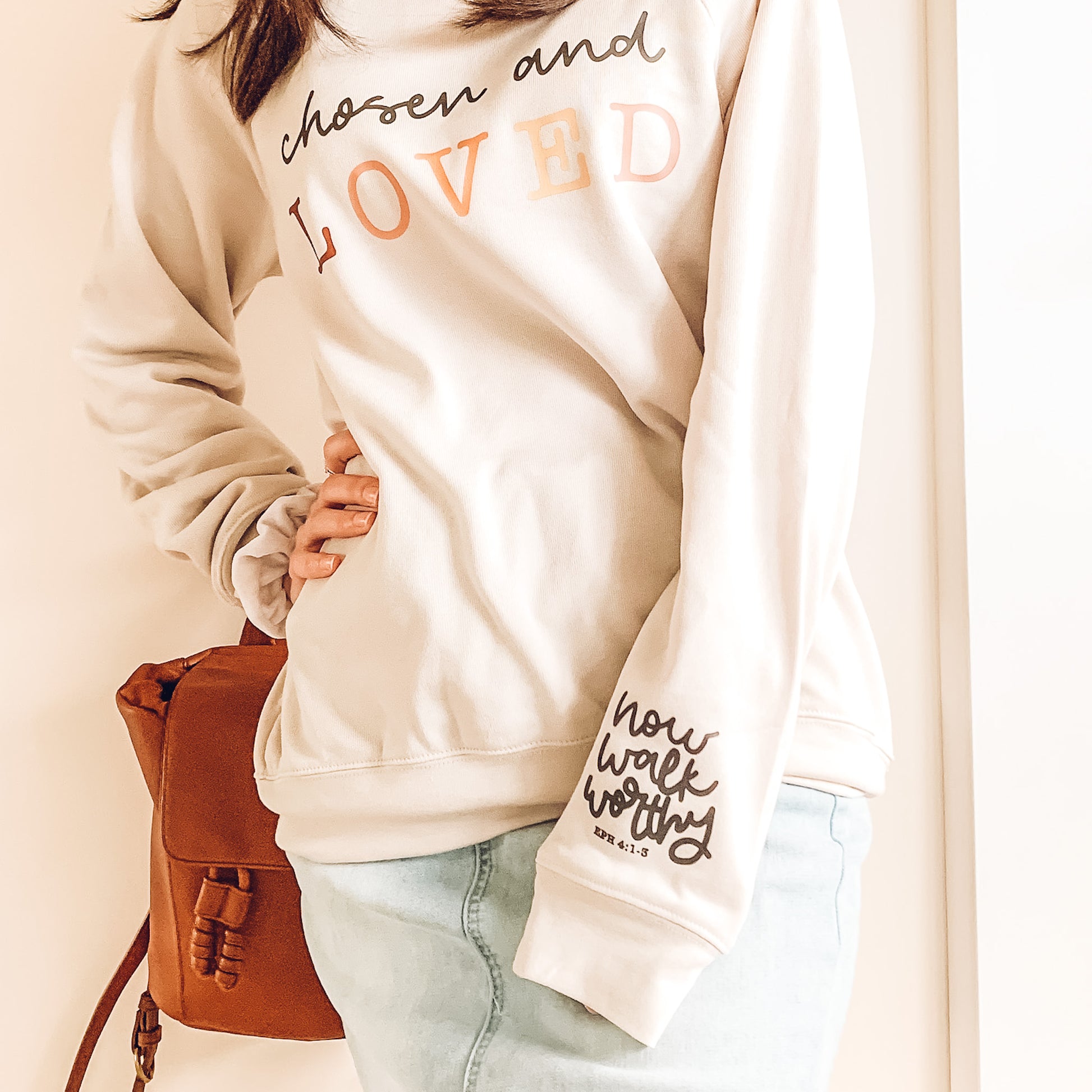 The design reads "Chosen and Loved" on the front and "Now Walk Worthy Eph. 3:1" on the sleeve.