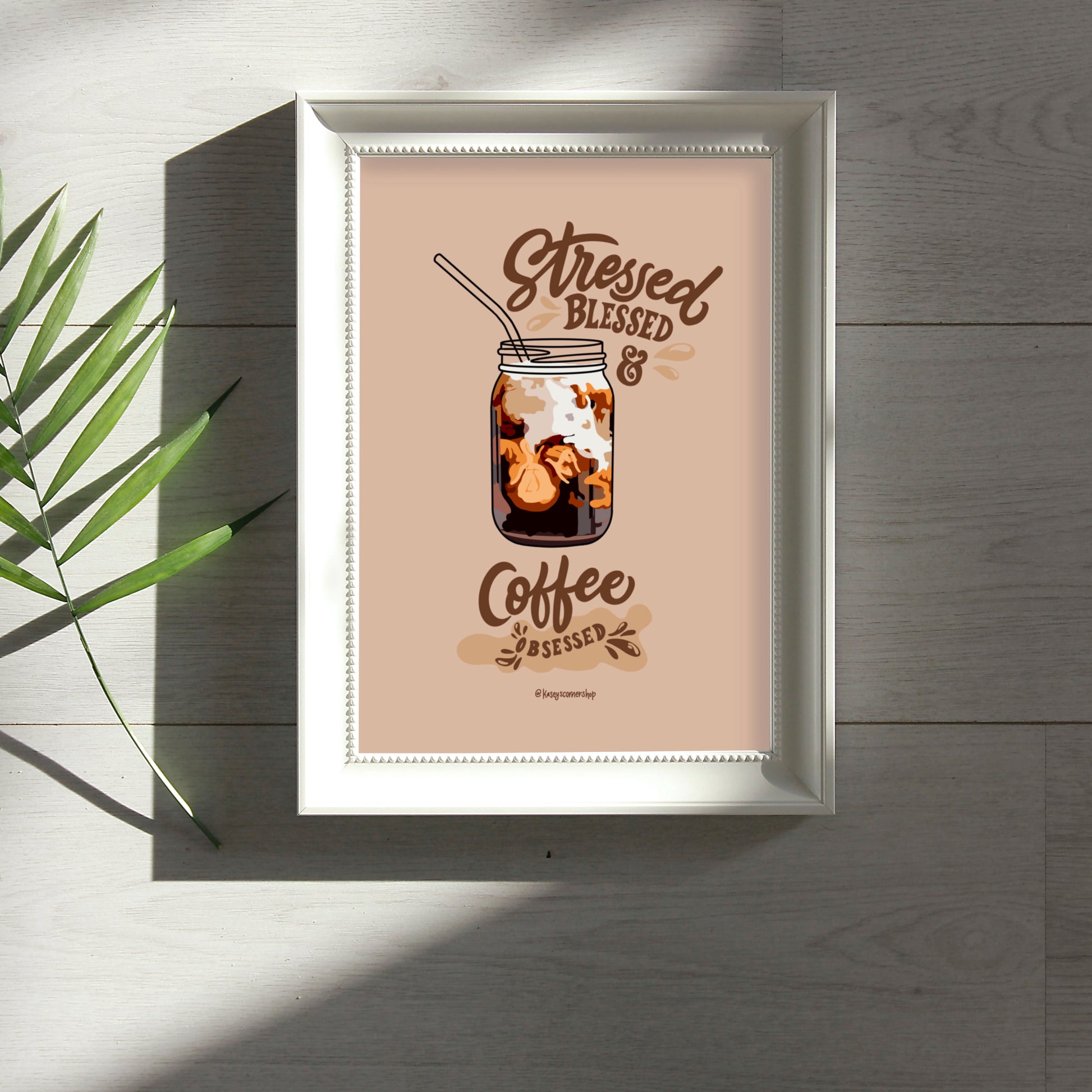 This 8" x 10" print features the fan favorite coffee lover design. Illustrative lettering reads "Stressed, blessed, & coffee obsessed." Printed on high-quality Photo Paper for beautiful, saturated colors and a professional, glossy finish. Made to last.