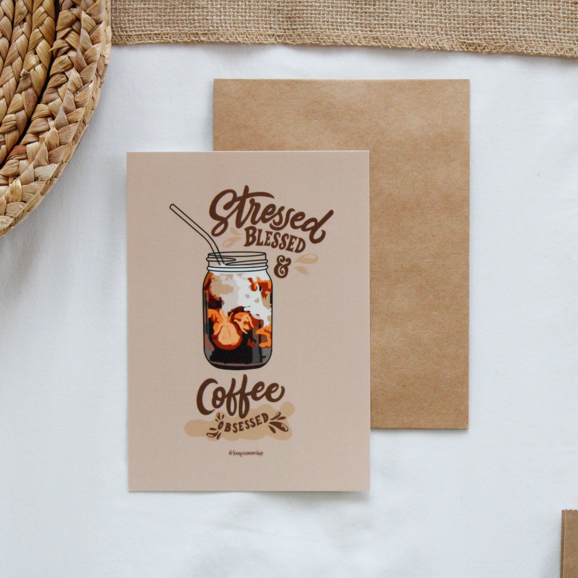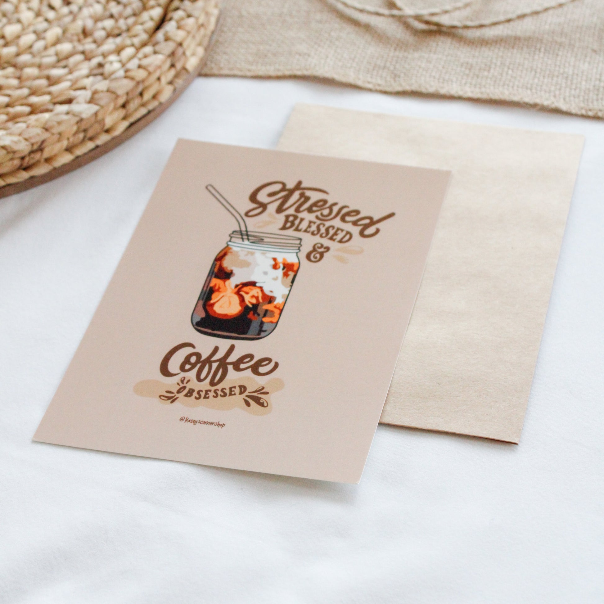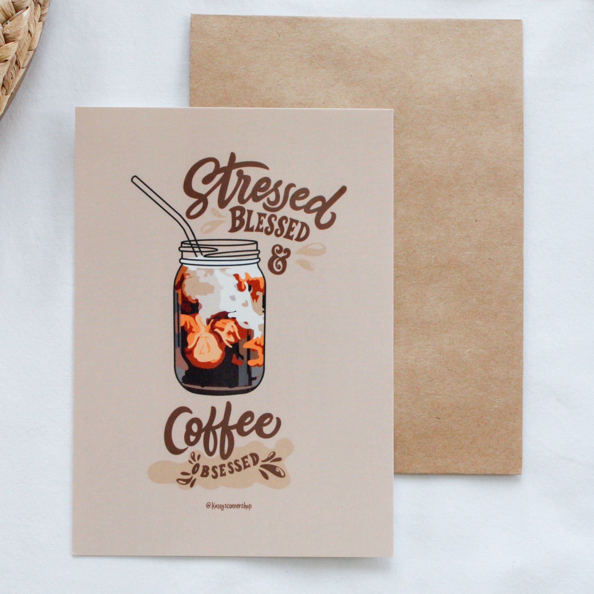 Reads: Stressed, Blessed, and Coffee Obsessed These postcards are standard size: 5” x 7”. Add a stamp and an address to the right-hand side of the back and a little note on the left-hand side then mail it to a friend! Or, frame it for cute décor on your wall or desk! I personally love to stick a pin in the top and attach it to a corkboard that hangs by my bed! I have even wrote a note on the back for a friend and sent the print in a 5" x 7" envelope. Add a note on your order if you would like a free, brown envelope to be sent with your print for your use!