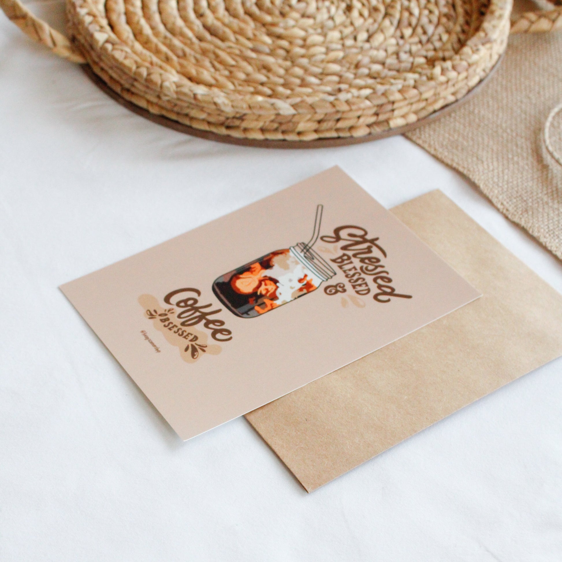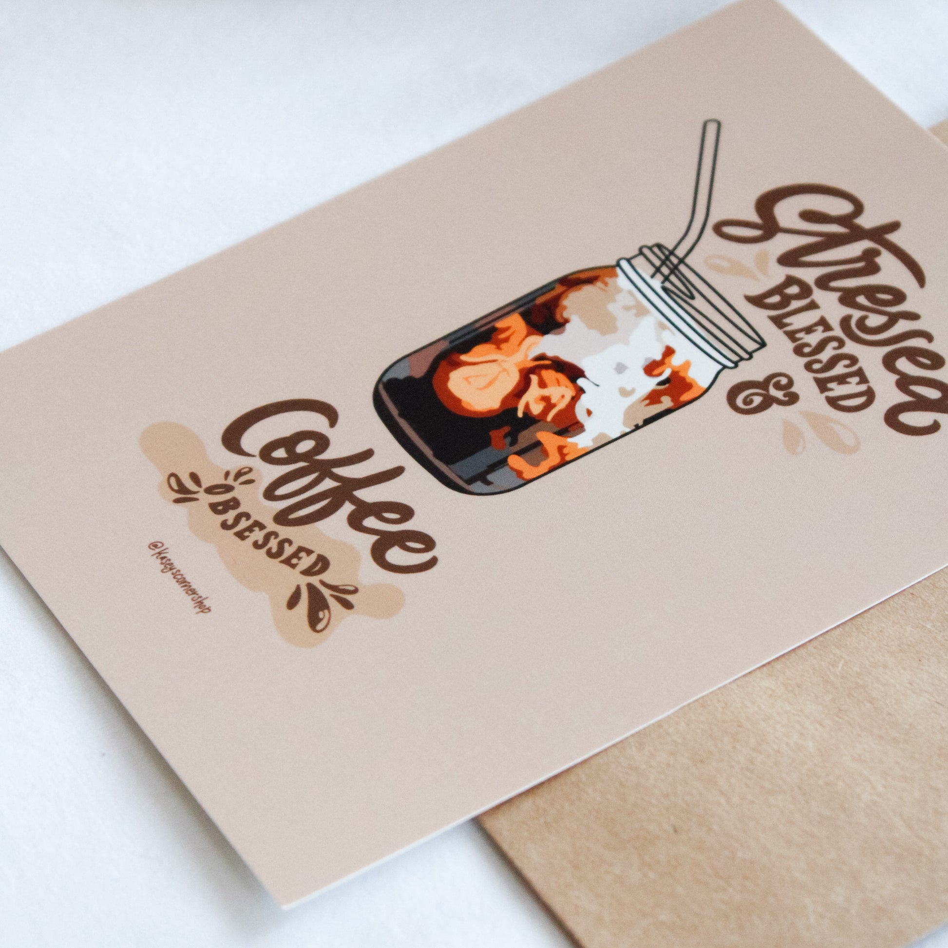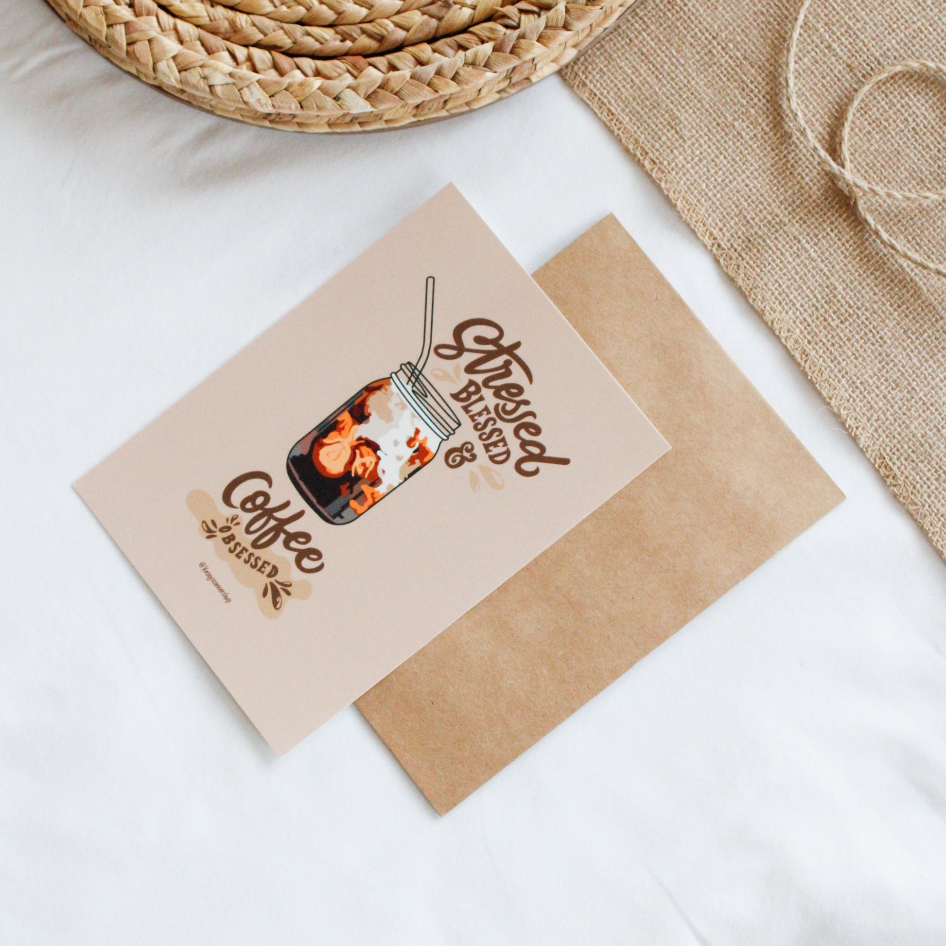 Reads: Stressed, Blessed, and Coffee Obsessed These postcards are standard size: 5” x 7”. Add a stamp and an address to the right-hand side of the back and a little note on the left-hand side then mail it to a friend! Or, frame it for cute décor on your wall or desk! I personally love to stick a pin in the top and attach it to a corkboard that hangs by my bed! I have even wrote a note on the back for a friend and sent the print in a 5" x 7" envelope. Add a note on your order if you would like a free, brown envelope to be sent with your print for your use!