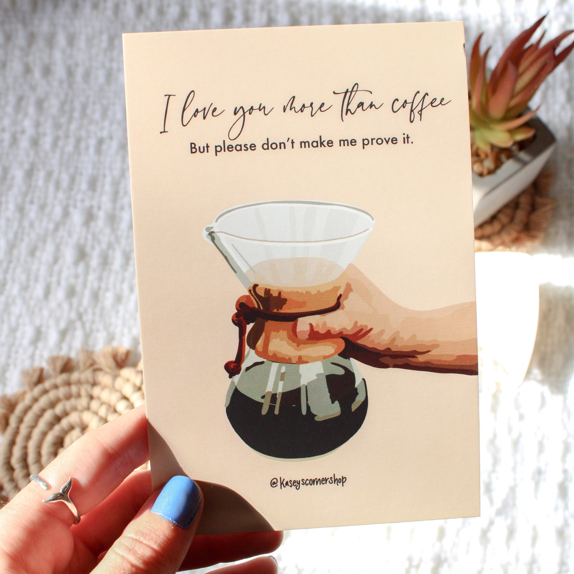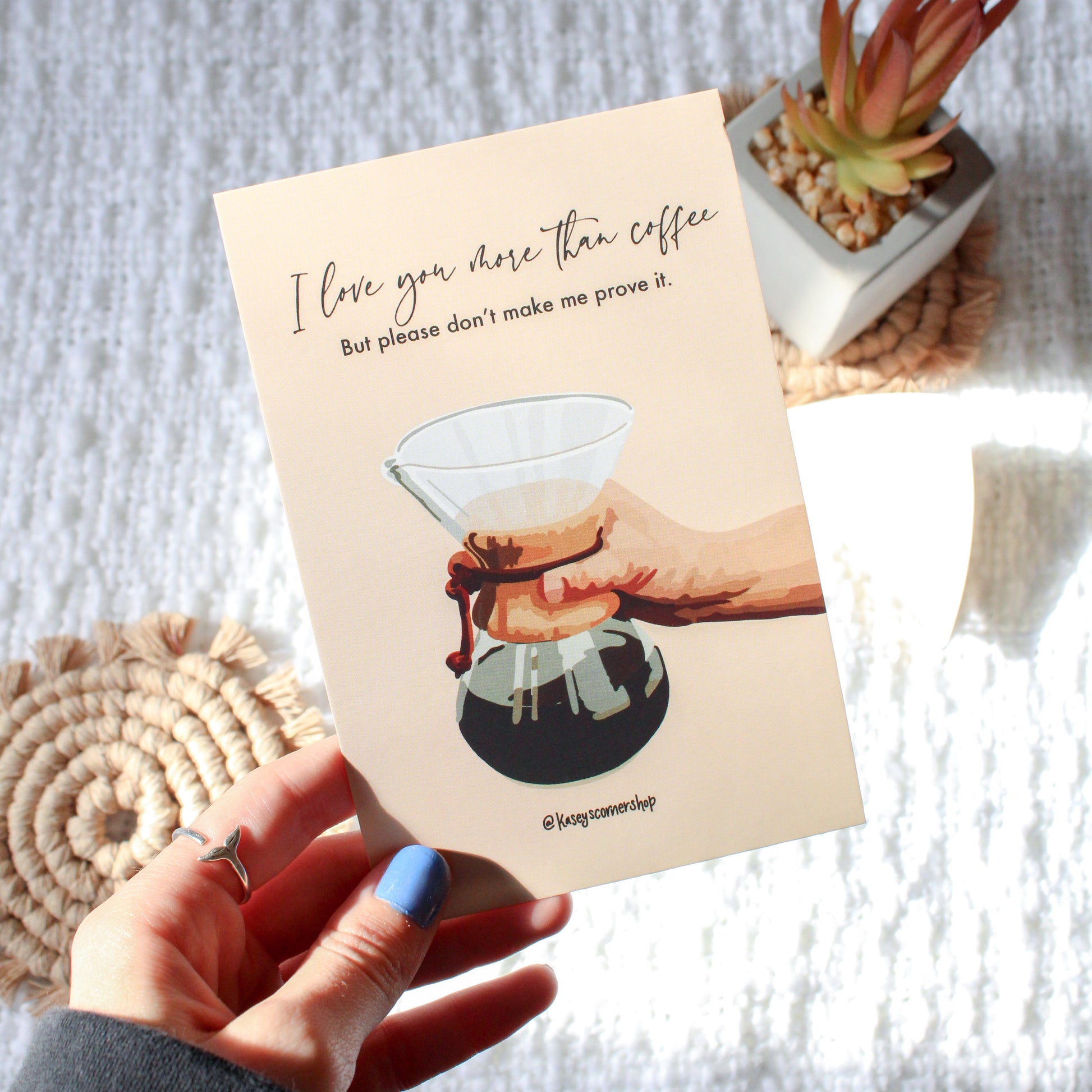 Tell your significant other, friend, or family member that you love them in a humorous way! Get this 4 inch by 6 inch glossy art print featuring a coffee illustration and this creative quote for your loved one to display in their home and keep close to their heart. The perfect gift idea for Christmas, birthdays, anniversaries, or just simply an out-of-the-blue "I love you!"