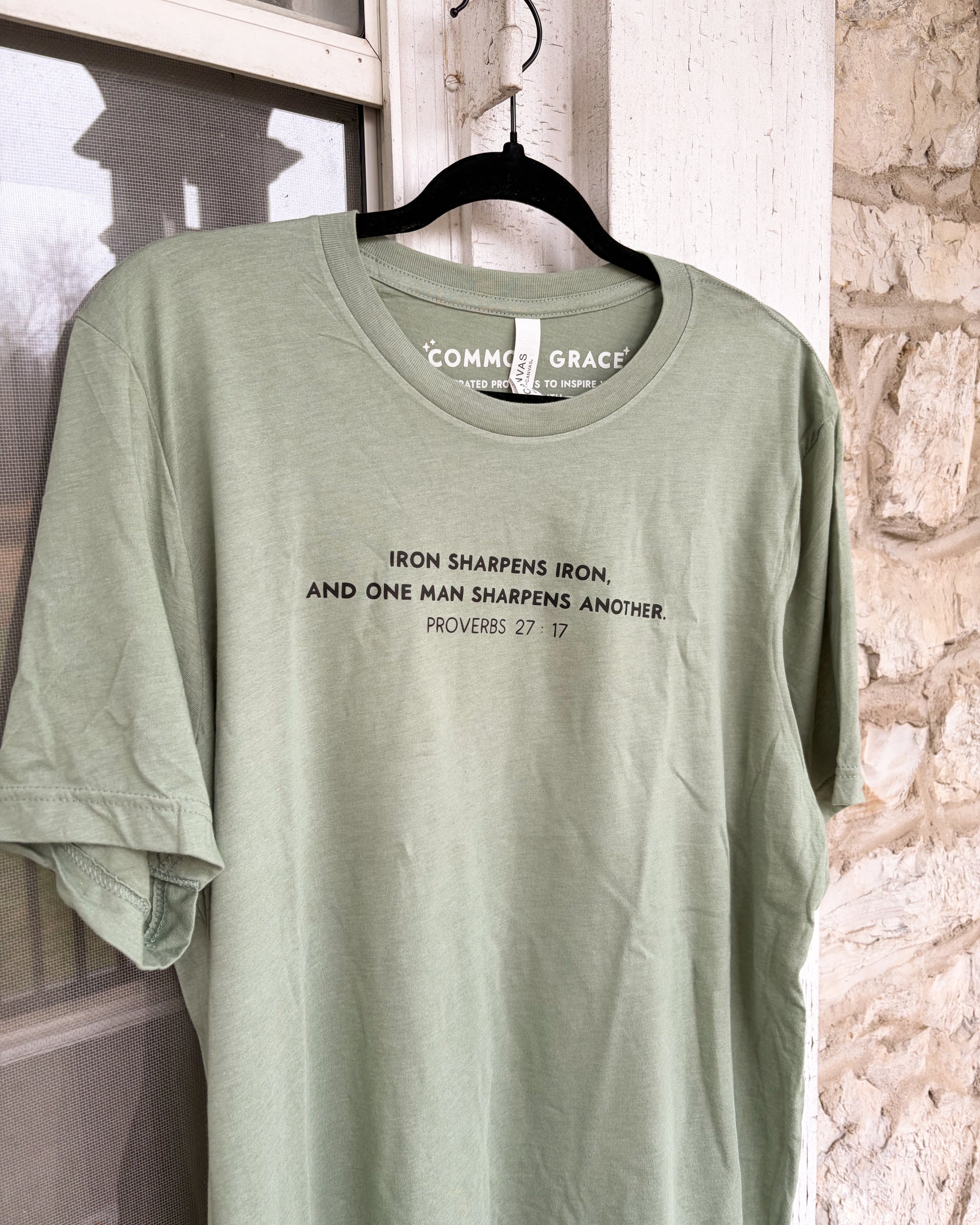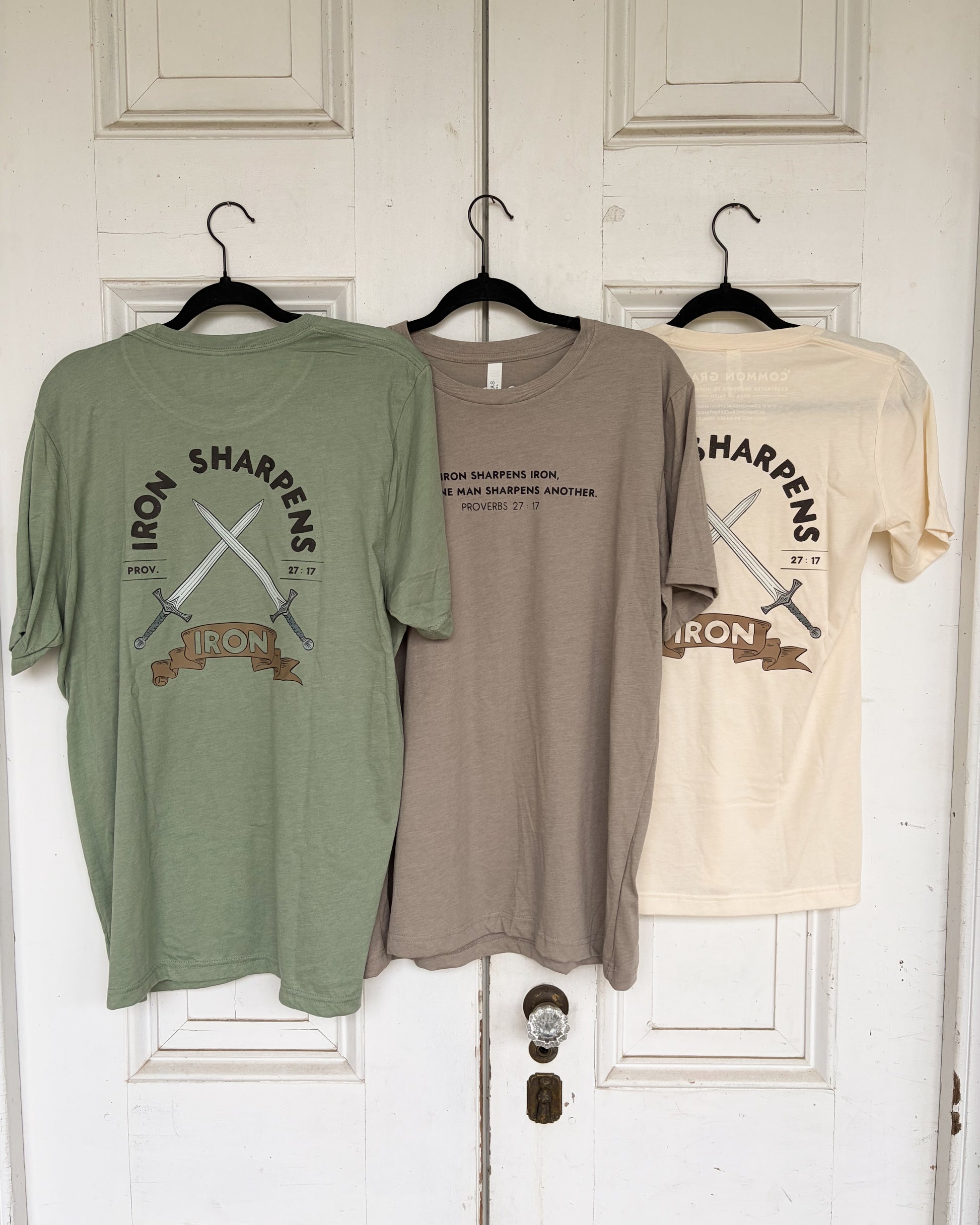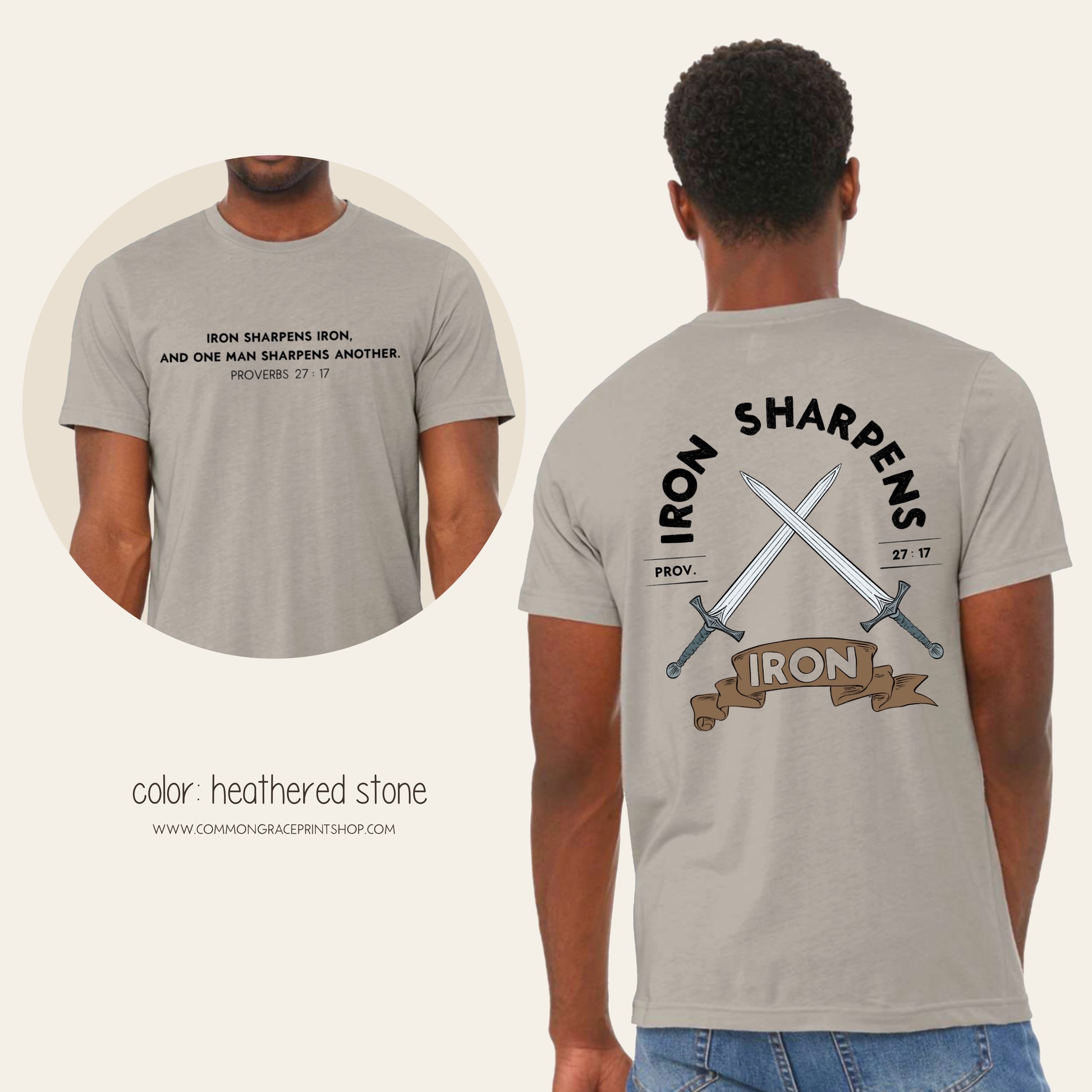 The front showcases the Scripture that sparked the design, while the back features a striking illustration of crossed swords with "Iron sharpens Iron" lettering. Crafted for everyday wear, this short-sleeve shirt comes in three versatile color options to match your style. Perfect for believers (men or women) seeking meaningful apparel that sparks conversations about faith and growth in holiness.