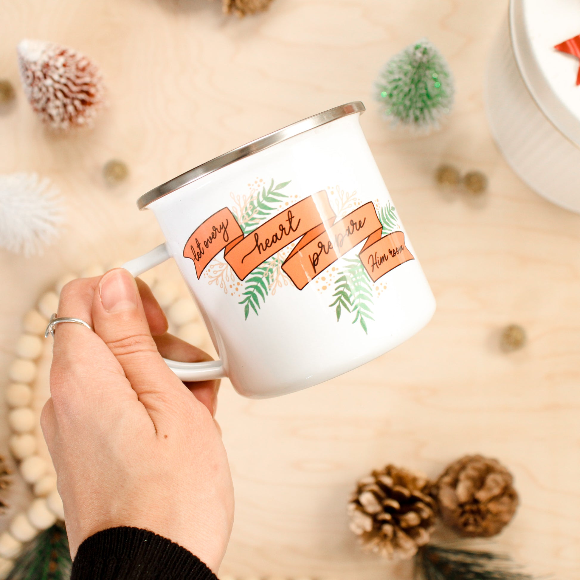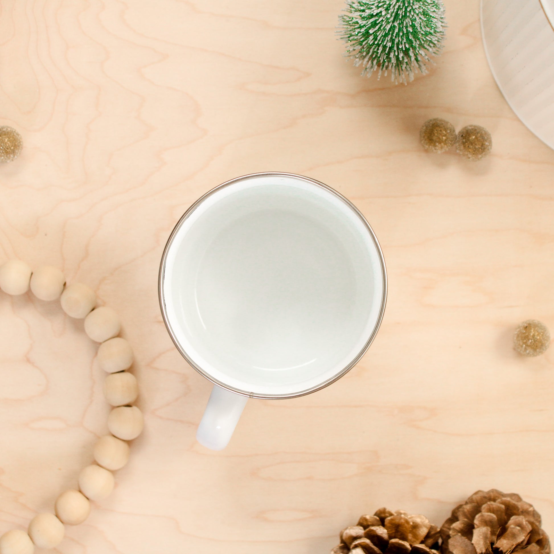 12 oz stainless steel camping mug with a silver rim. Gently distressed handle gives a rustic feel. Sublimation printed for longest lasting results. Recommend hand washing.