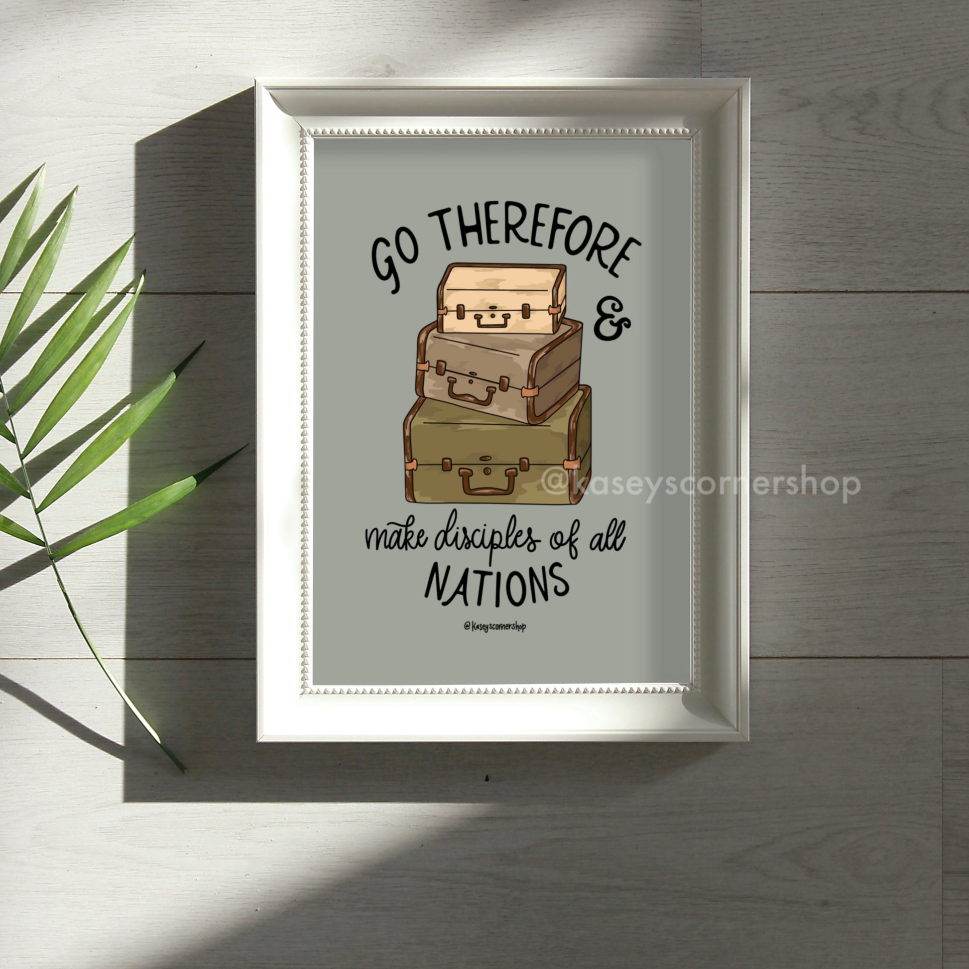 Please note that the mat and frame shown in the product photo are not included. Purchase includes (1) 8" x 10" high-quality gloss art print. Design reads "Go therefore & make disciples of all nations" and features three neutral colored suitcases. The perfect gift for any Christian looking for neutral wall art for any bedroom, office, and more! The art print is printed upon order, so please have patience as we print your order just for you. Printed on high-quality photo paper that brings out colors in a beautiful way. All prints are packaged in protective cello bags and mailed in rigid mailers for the most protection possible.