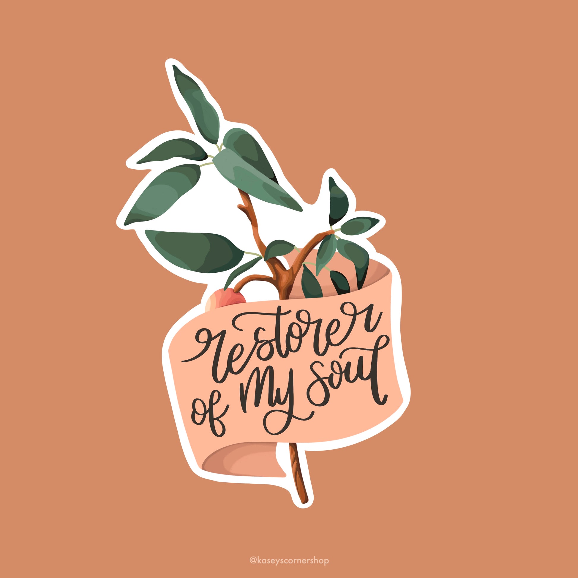 This design reads "Restorer of My Soul" and features a branch from a fruitful peach tree.