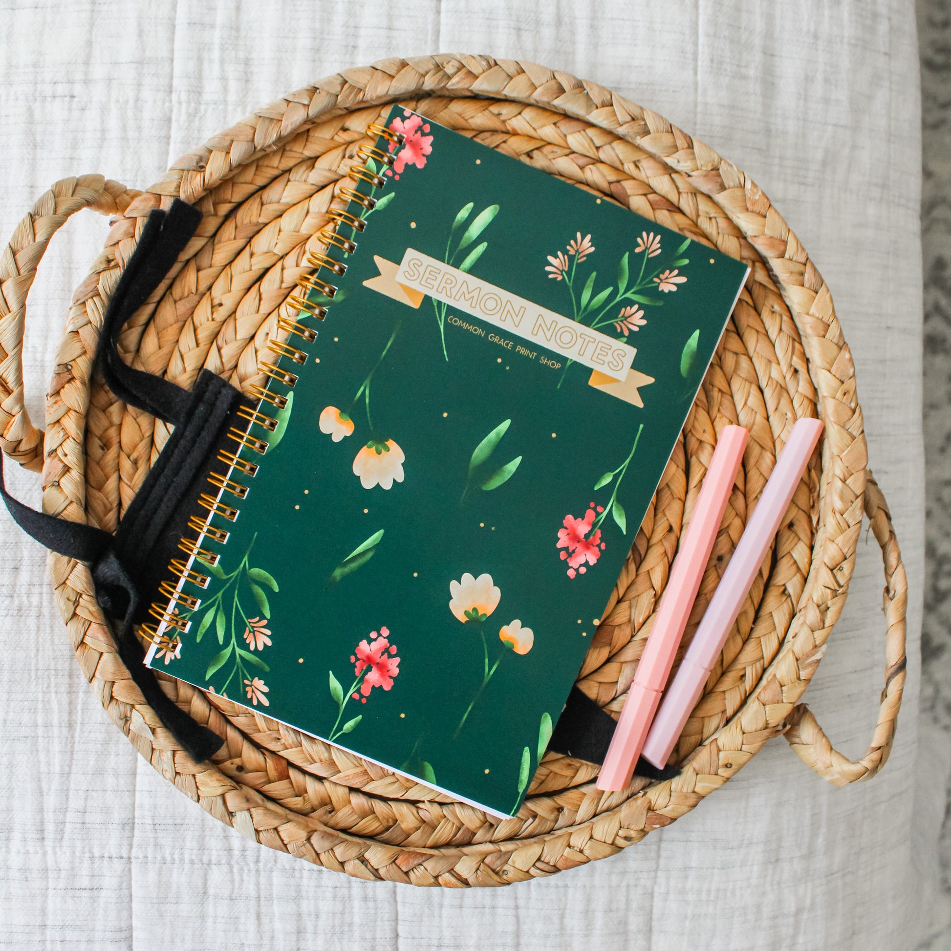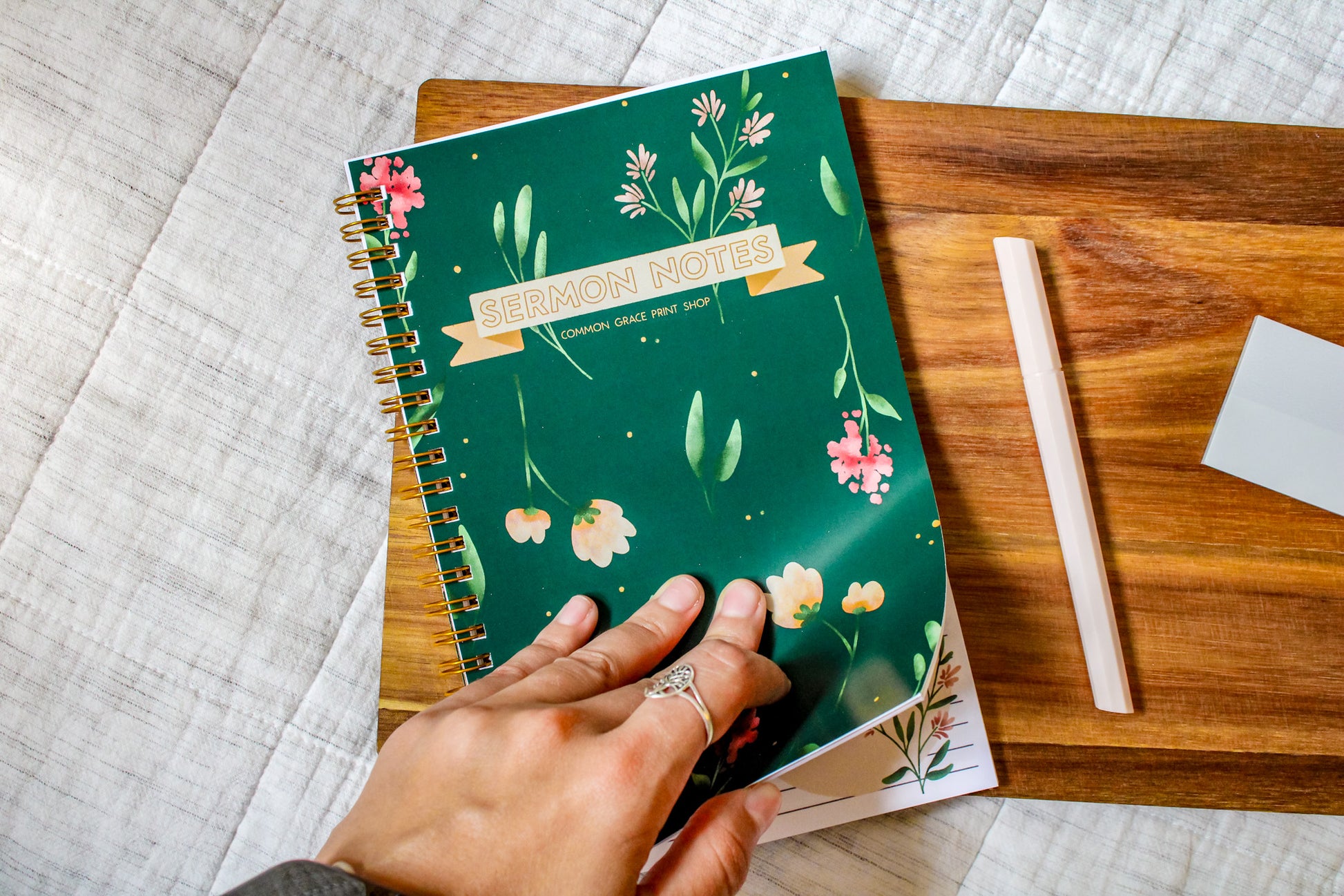 A beautiful handmade notebook to take notes in church. High quality covers with a heavy weight book board before the back cover combined with wire binding make a long-lasting journal. Illustrated by Kasey and printed & assembled in house.