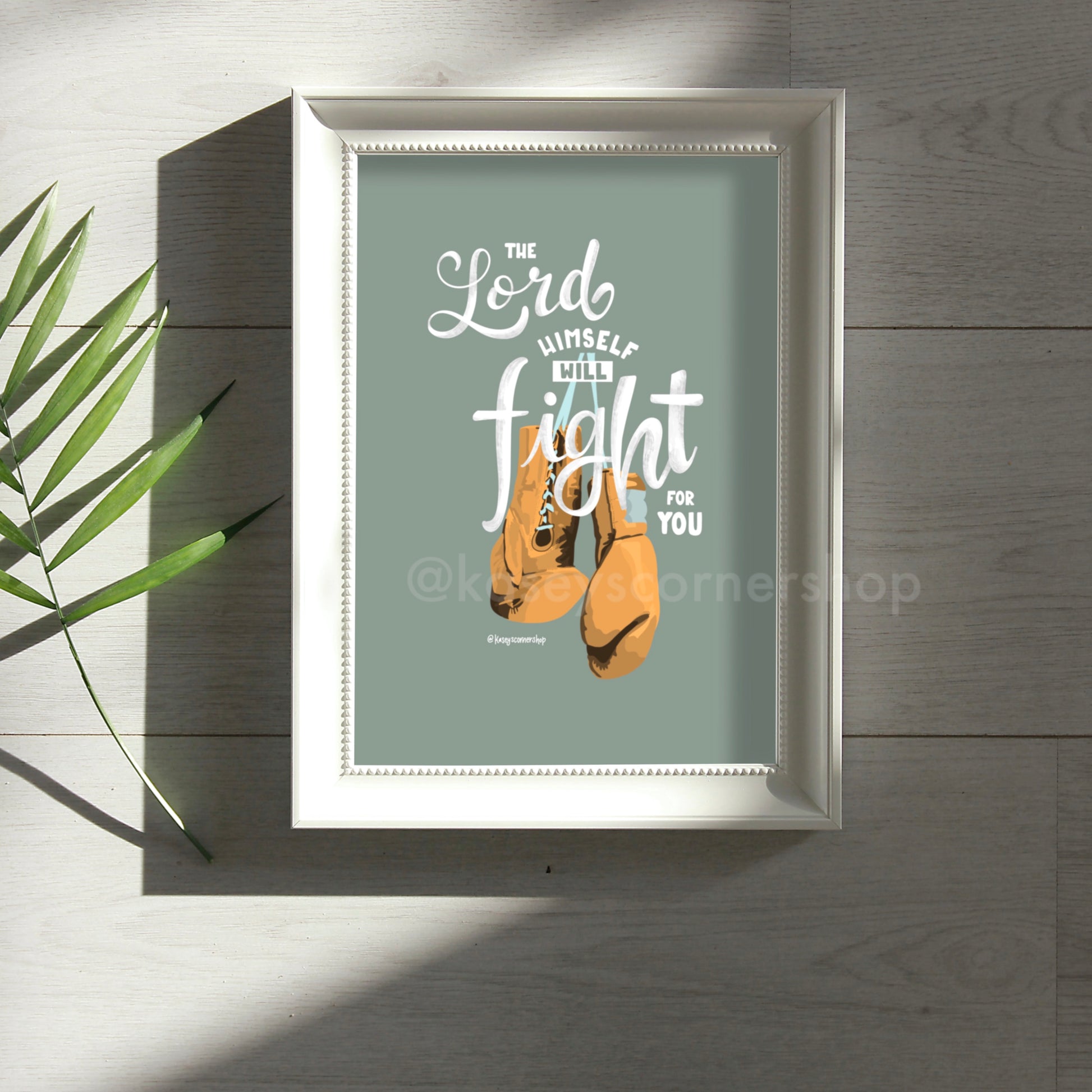 Please note that the mat and frame shown in the product photo are not included. Purchase includes (1) 8" x 10" high-quality gloss art print. Design reads "The Lord Himself will Fight for You" and features a pair of boxing gloves. The perfect gift for anyone needing encouragement or just a reminder. The art print is printed upon order, so please have patience as we print your order just for you. Printed on high-quality photo paper that brings out colors in a beautiful way. All prints are packaged in protective cello bags and mailed in rigid mailers for the most protection possible.