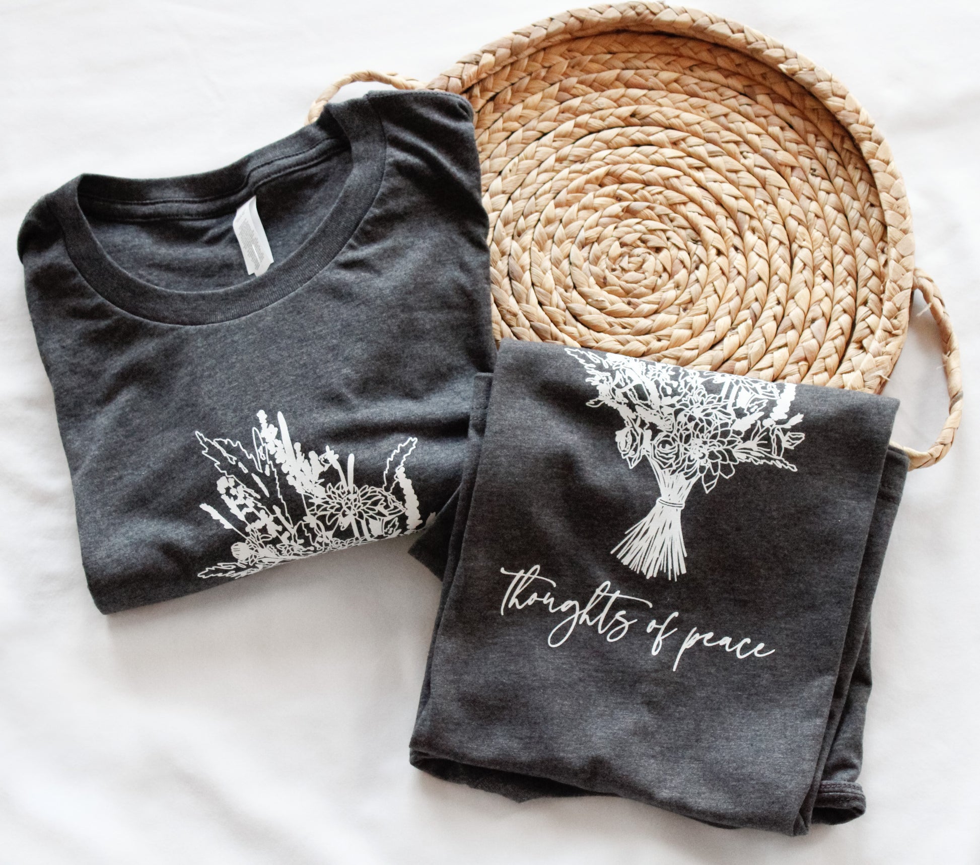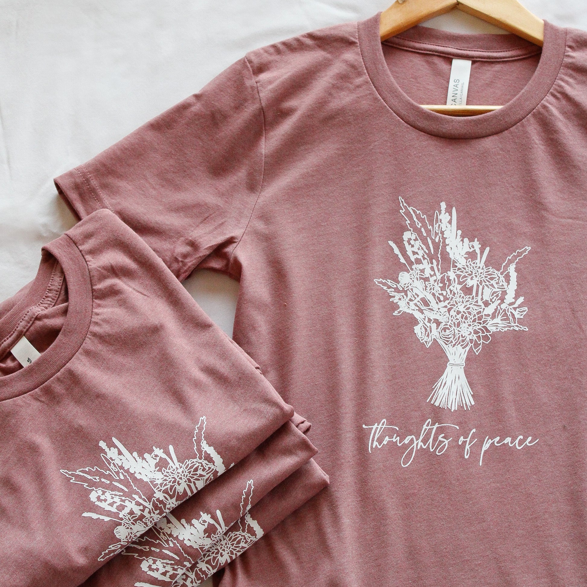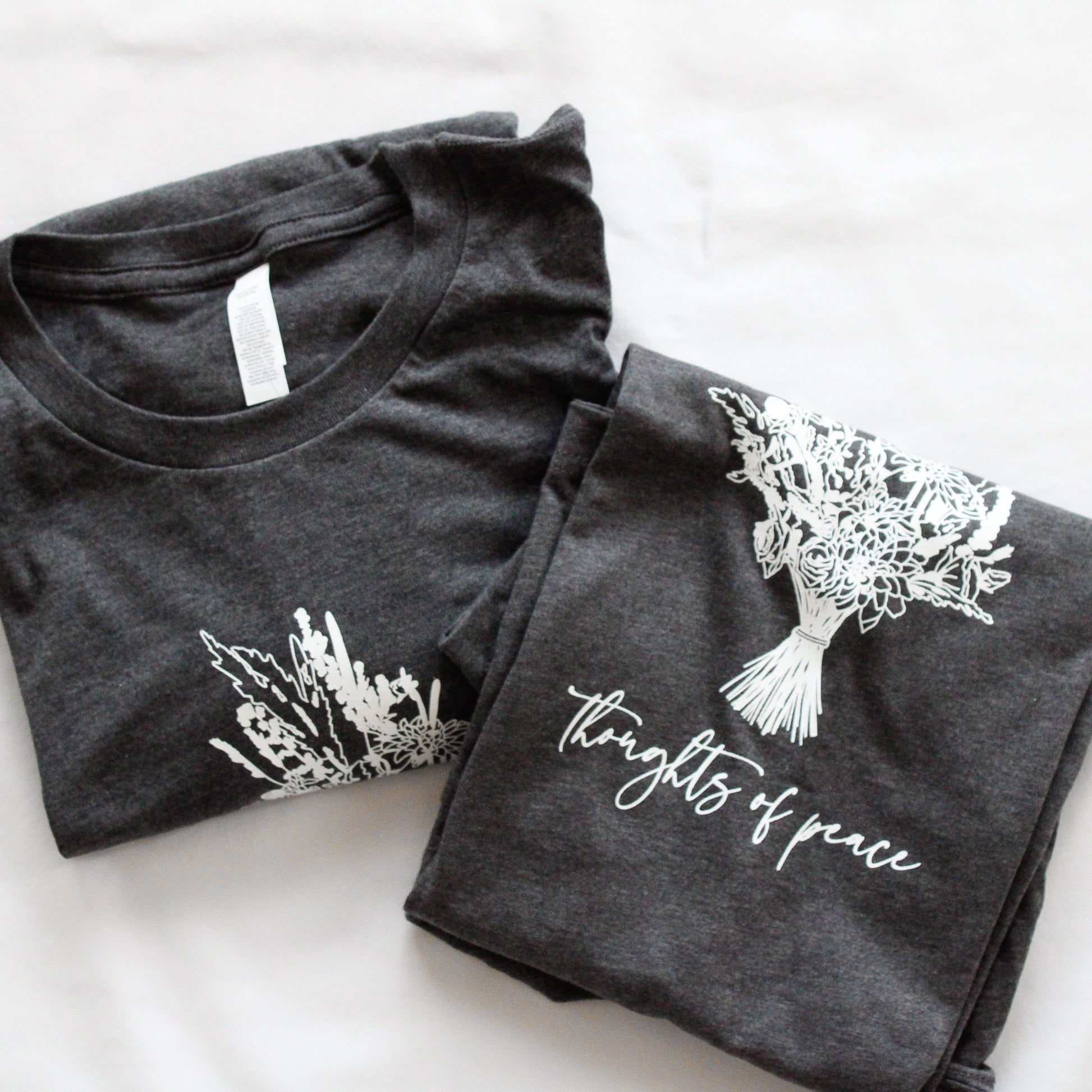 The design reads "Thoughts of Peace" and features a flower bouquet--illustrated and hand-lettered. Based on the Bible verse from Jeremiah 29:11: "For I know the thoughts that I think toward you, saith the Lord, thoughts of peace, and not of evil, to give you an expected end." Our hope is that this shirt will not only encourage you as you wear it, but also those you come in contact with as you go through life. After all, we are called to spread the Word and be the Light in this sin-darkened world. <3