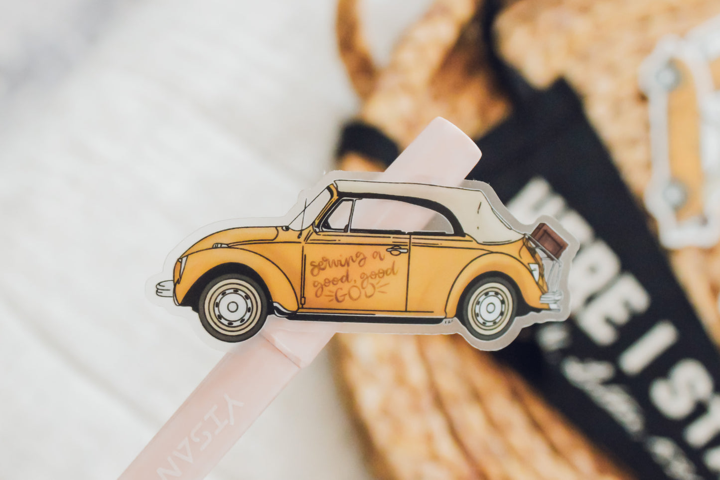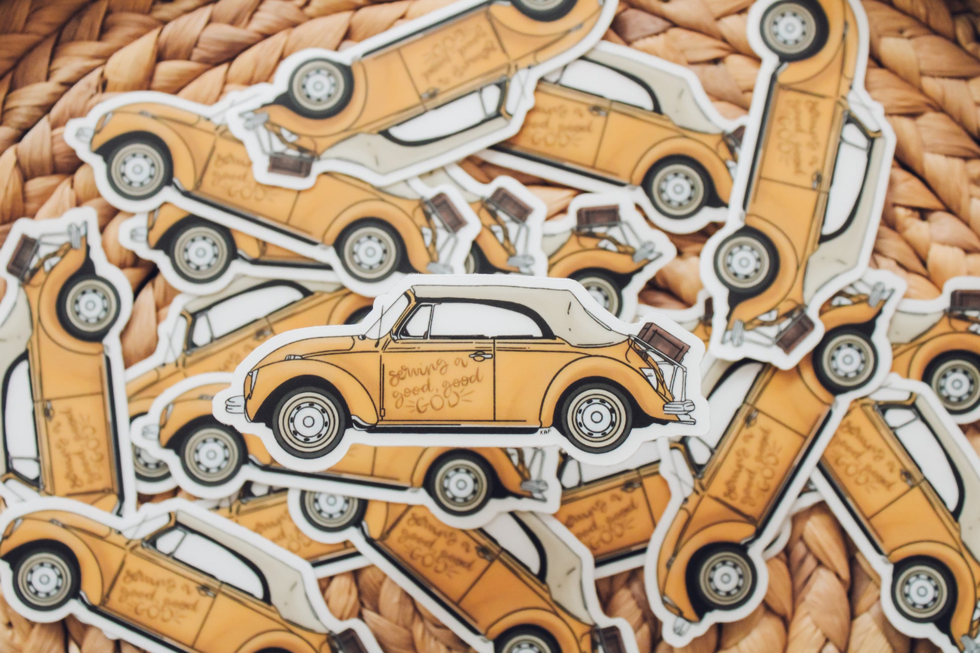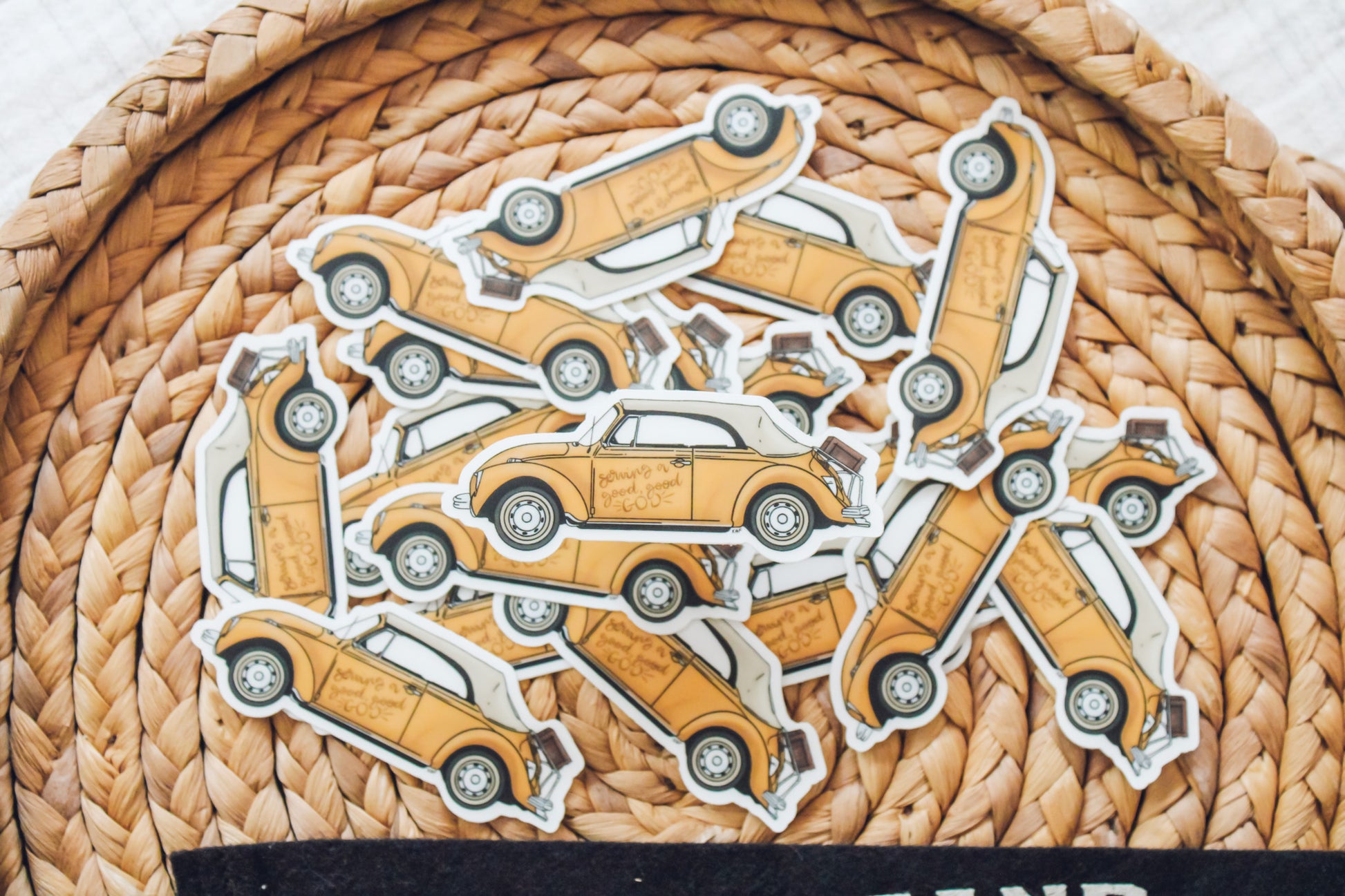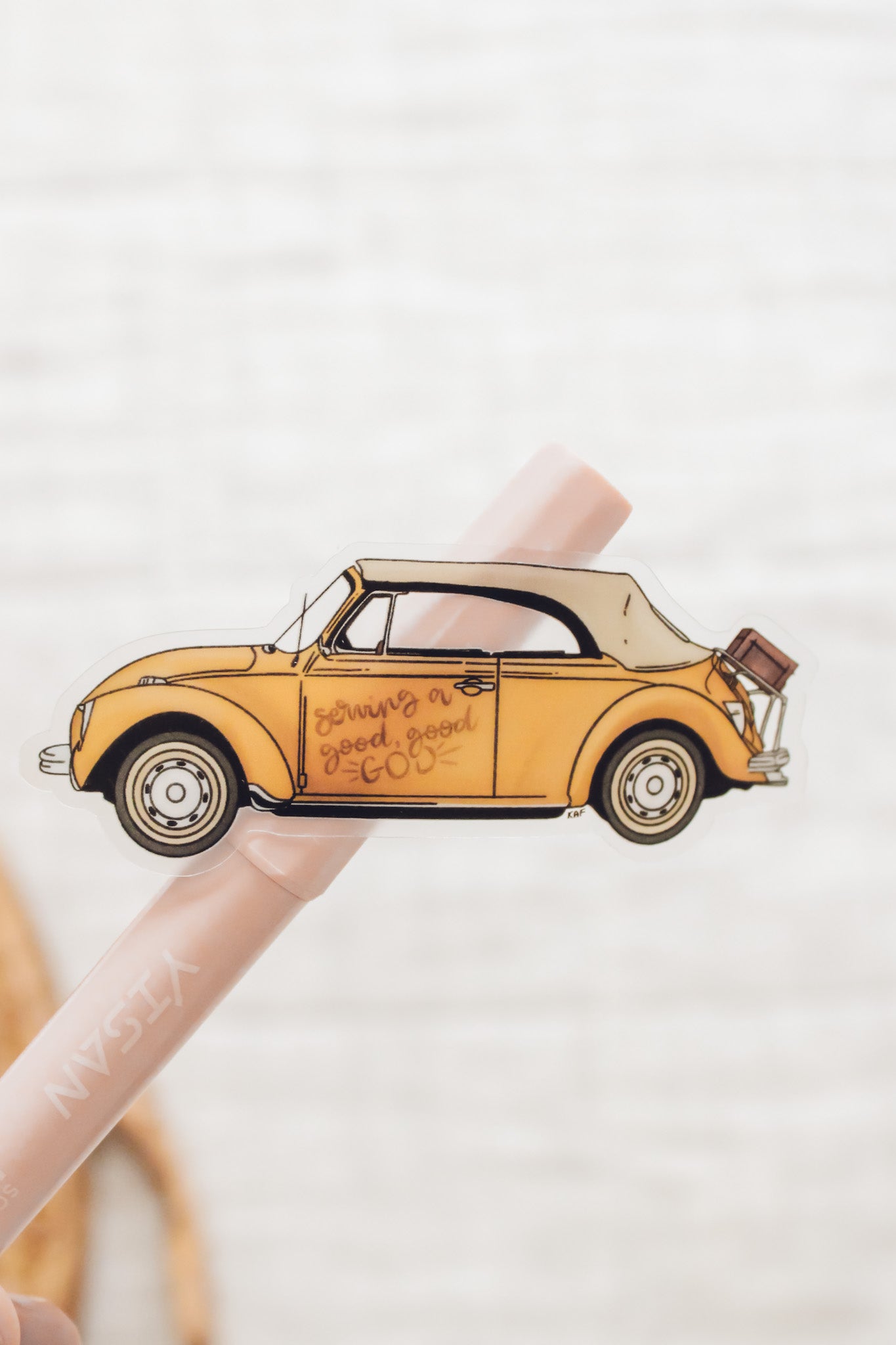 Declare your faith everywhere you go with this waterproof, 3" long vinyl sticker featuring a bright yellow VW Bug and the phrase "Serving a good, good God". Perfect for laptops, water bottles, and more, this clear sticker is sure to be a conversation starter.