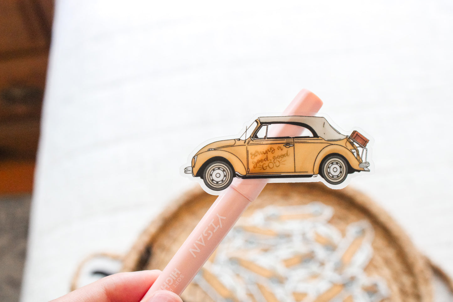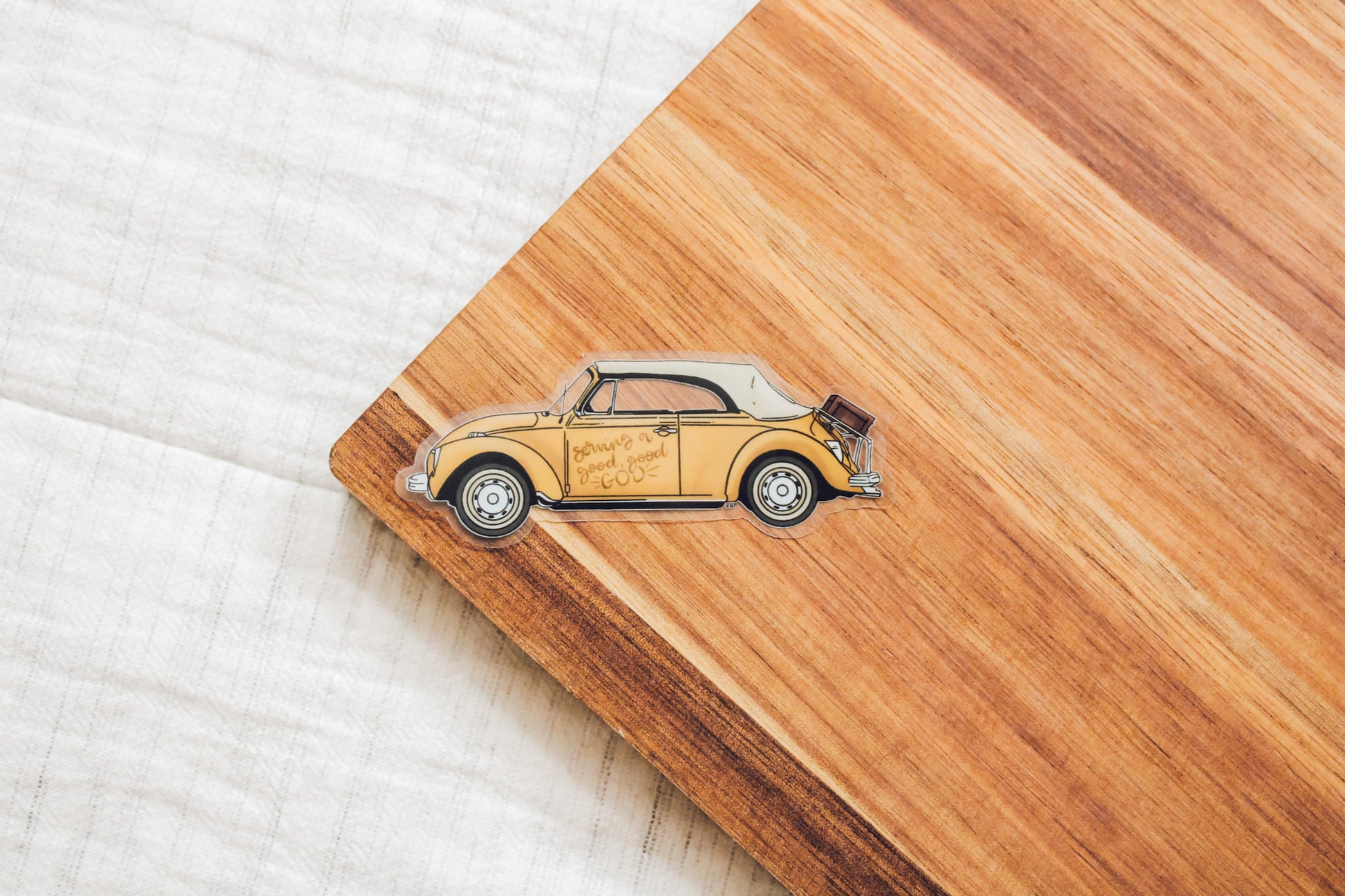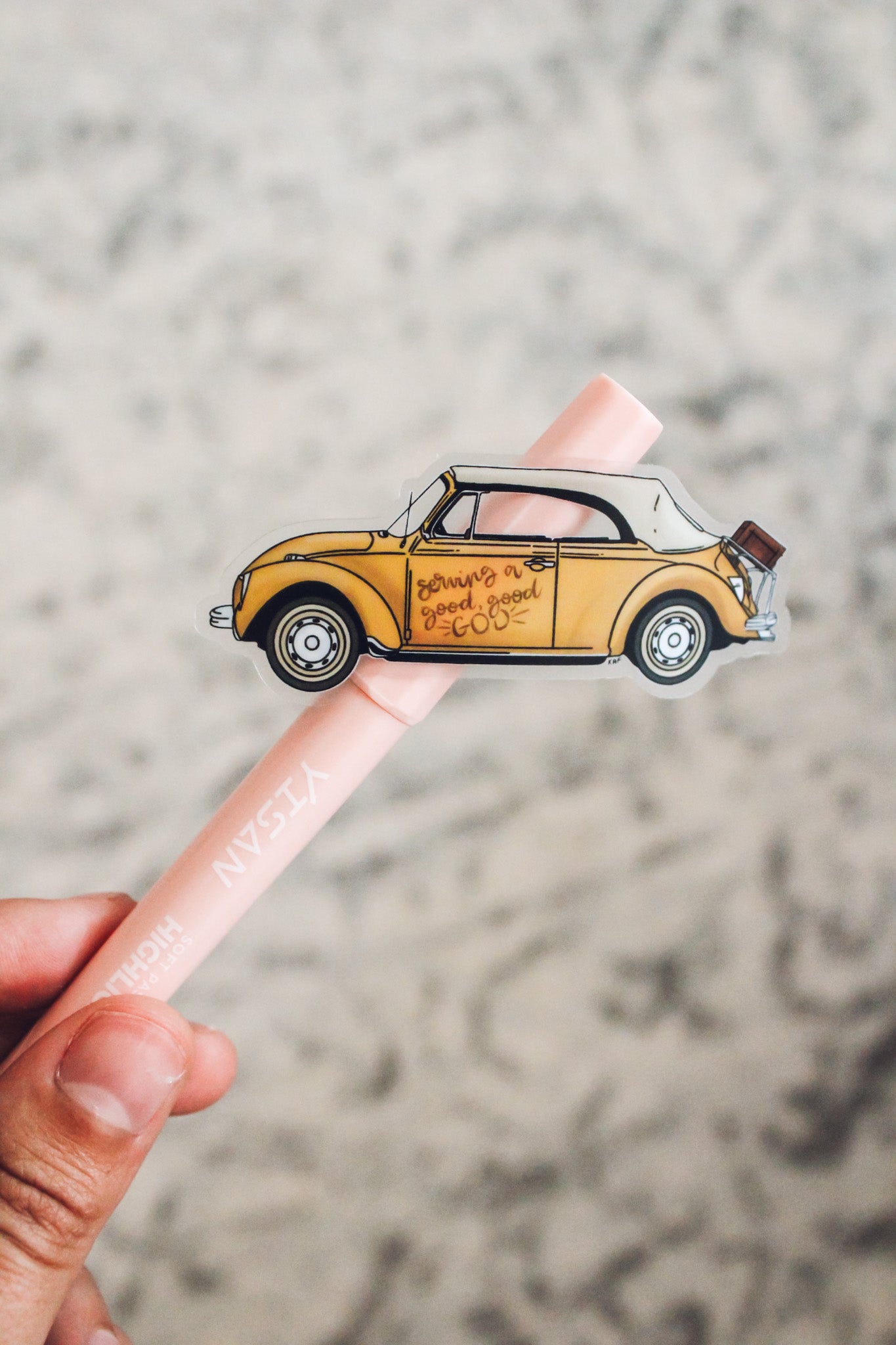 Declare your faith everywhere you go with this waterproof, 3" long vinyl sticker featuring a bright yellow VW Bug and the phrase "Serving a good, good God". Perfect for laptops, water bottles, and more, this clear sticker is sure to be a conversation starter.