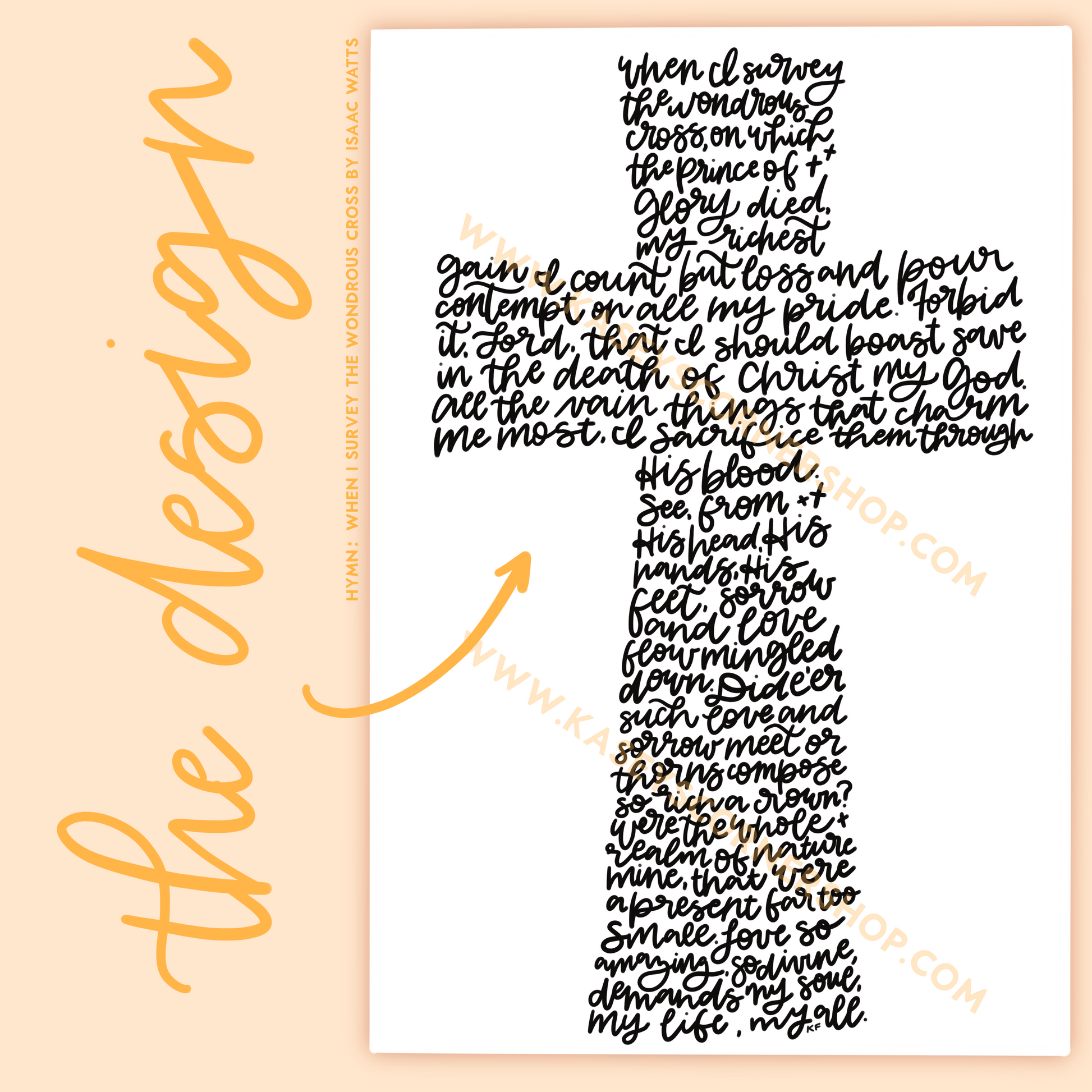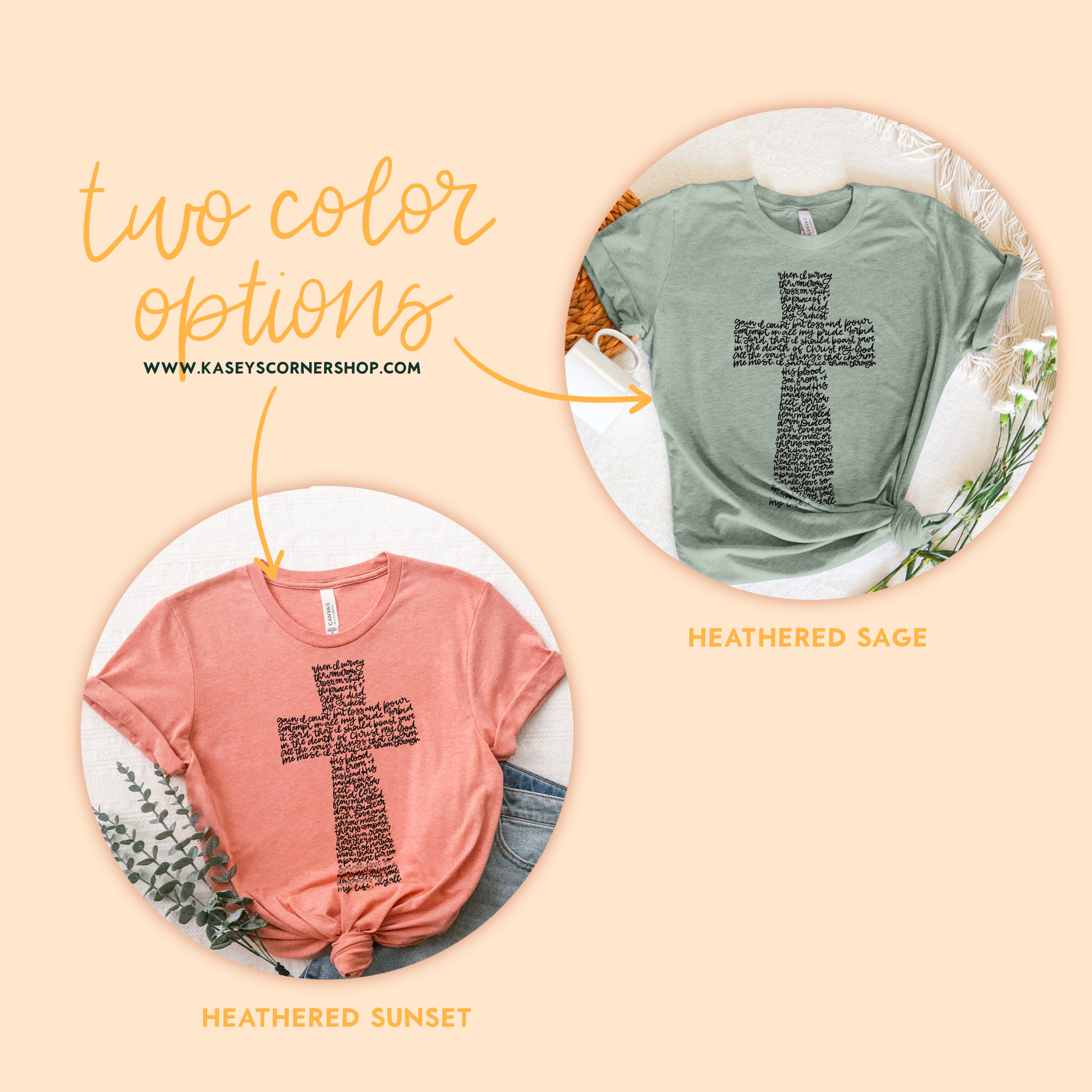 Choose between heather sage and heather sunset - two soft spring colors that, in my opinion, perfectly compliment the hope and joy of the Easter season. This design is hand lettered with the words to "When I Survey the Wondrous Cross" in the shape of a cross.