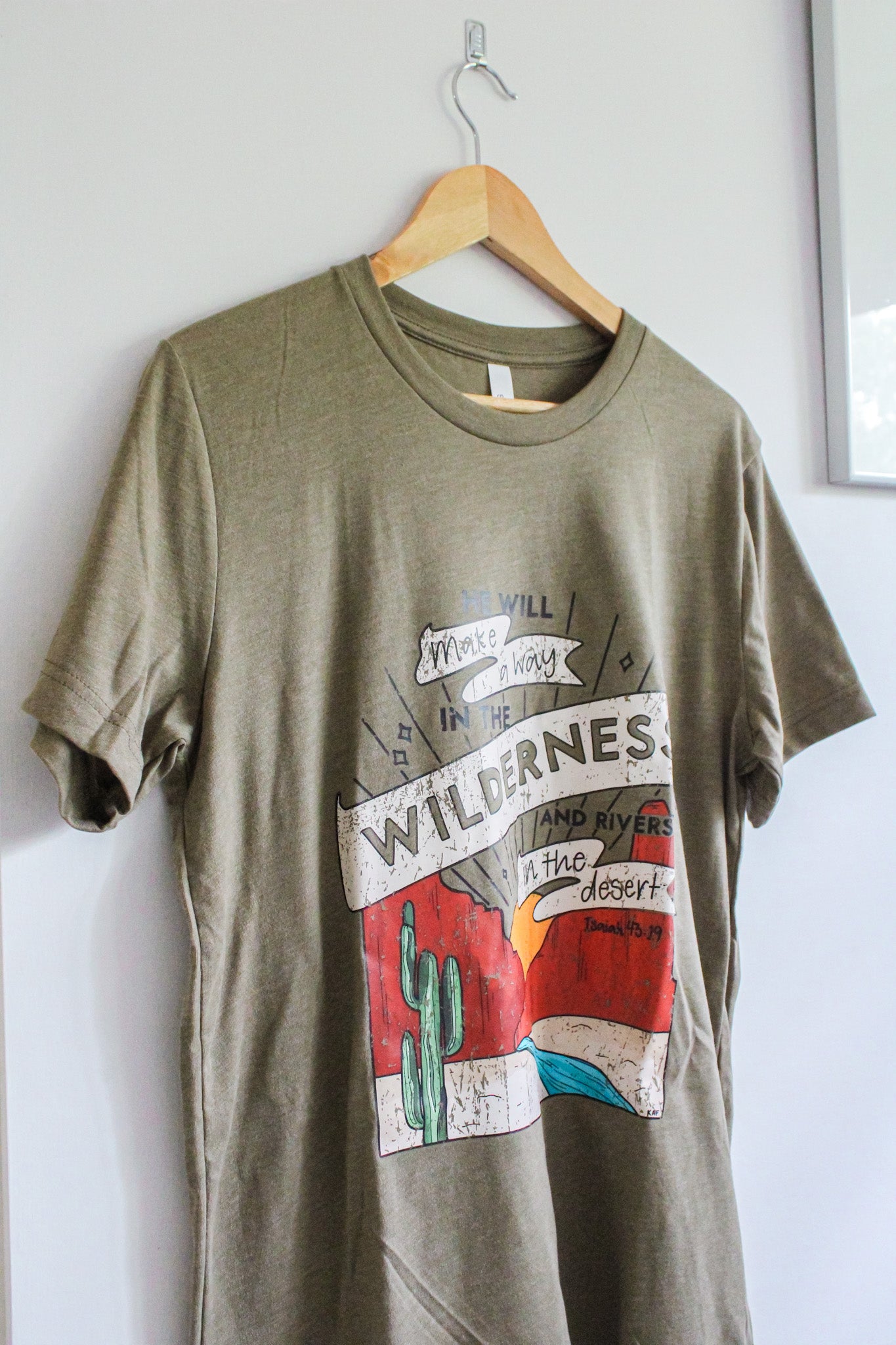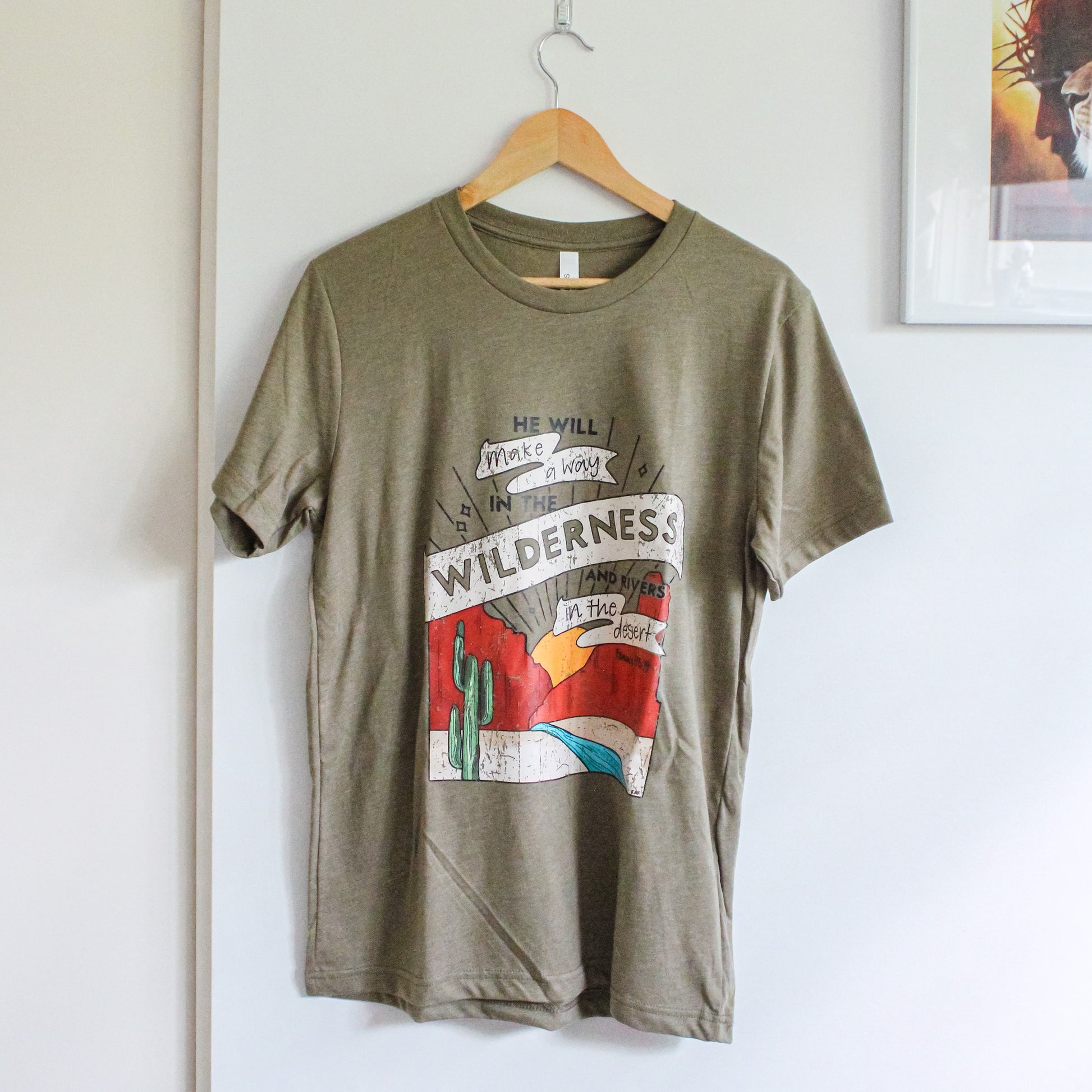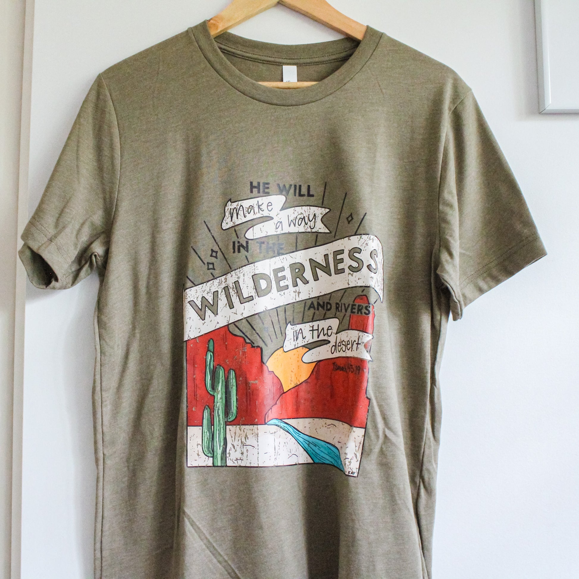 Our Wilderness Short-Sleeve Tee is a stylish vintage-look piece that blends comfort and faith. Constructed with a soft cotton and polyester blend, this shirt is preshrunk and sure to last. Showcasing an illustrative design of the river flowing through the desert, this olive green tee also features a powerful Bible verse from Isaiah 43:19 - the inspiration for the tee. Express your faith in style with the Wilderness Short-Sleeve Tee. Such a great reminder that "He will make a way in the wilderness and rivers in the desert."