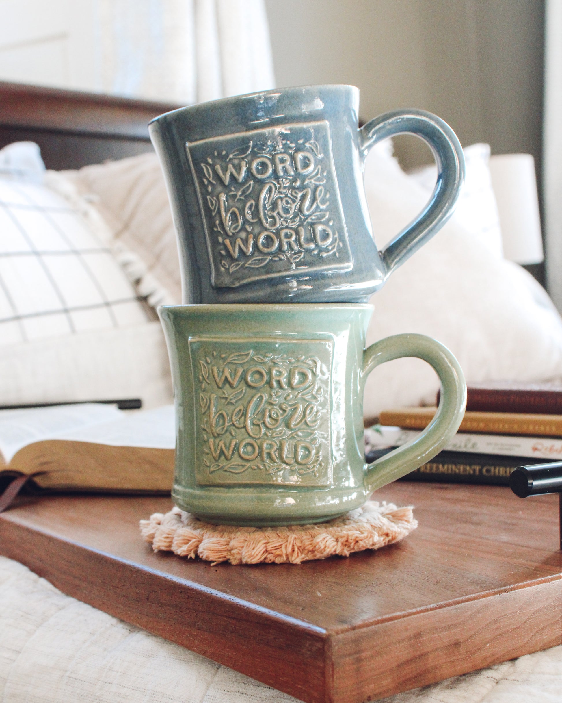Enjoy your favorite beverage in the "Word before World" ceramic mug, hand thrown in Waco, Texas. This 11-ounce mug is available in four beautiful glaze options, each adding a unique touch to your daily routine. Its quality craftsmanship and comfortable size make it perfect for morning coffee or afternoon tea, while putting Truth in front of you.