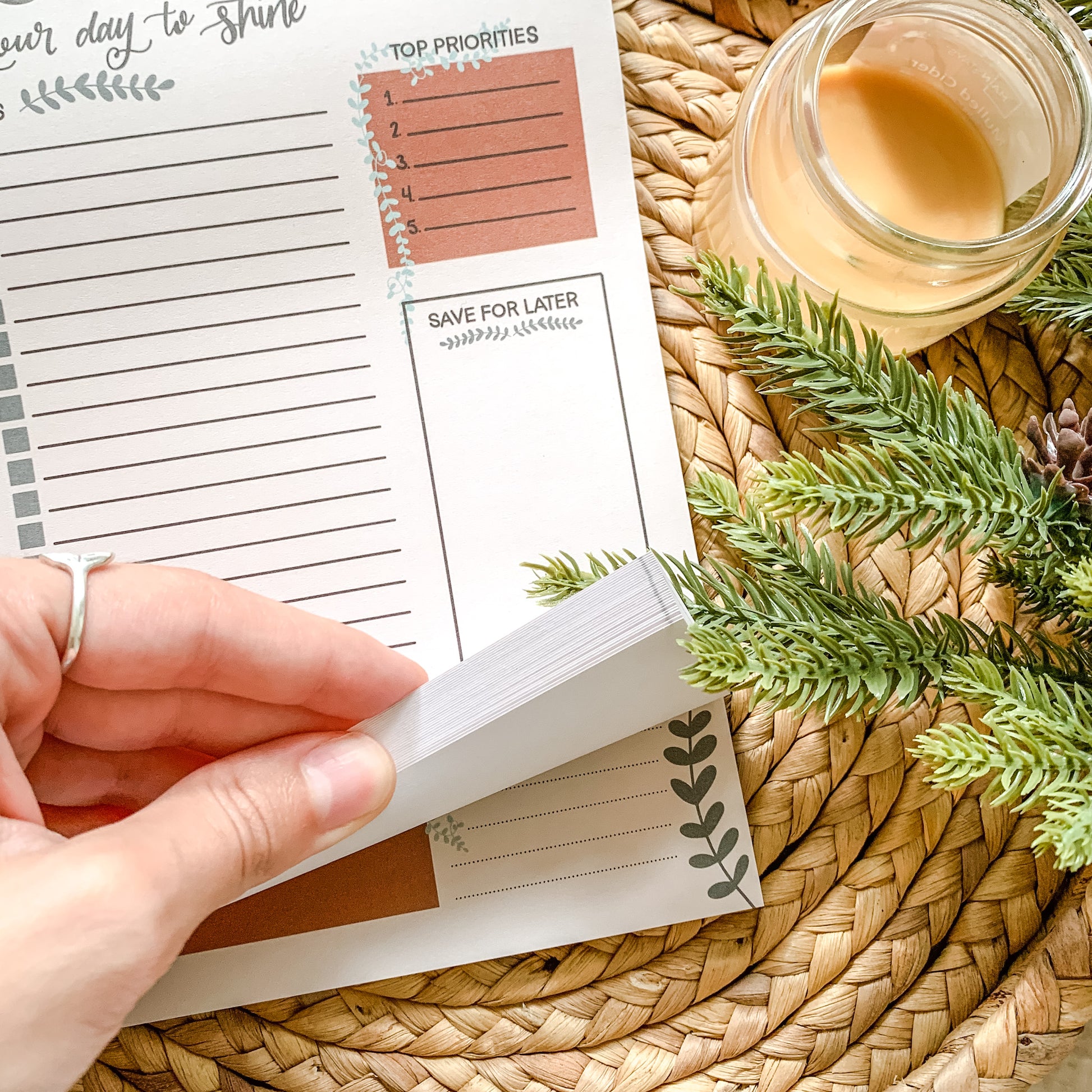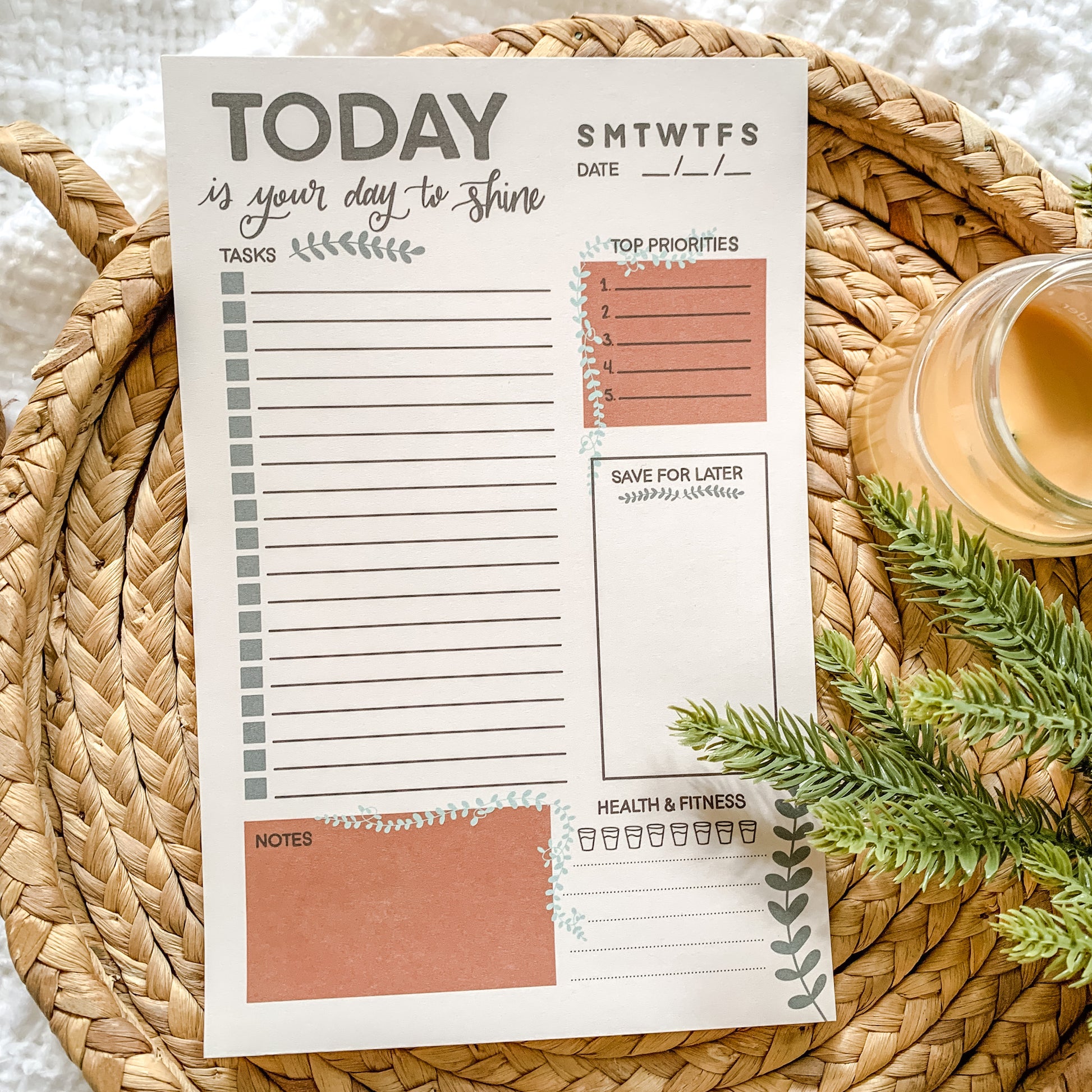 Keep your day in order with this 100-page top-bound notepads! Hand-lettered sections include a to-do list, "top priorities" section, "save for later" box, a note area, as well as a "health & fitness" tracker. Once your day is over, simply tear the page off and continue on! Backed with a sturdy cardboard backing.